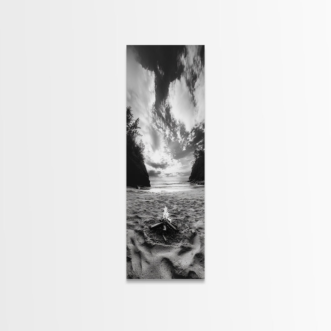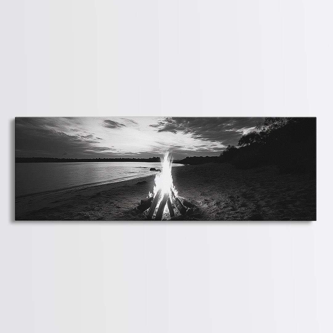 Beach Bonfire, coastal landscape art, rustic decor, moody art, dramatic seascape, black and white, framed canvas print, nautical wall art