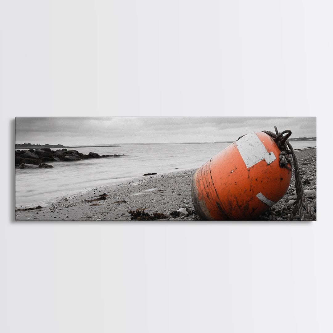 Beach Buoy, Coastal Drift, Orange Marker, Tidal Shore, Framed Canvas Print, Bathroom Wall Decor, Nautical Minimalism, Modern Ocean Art