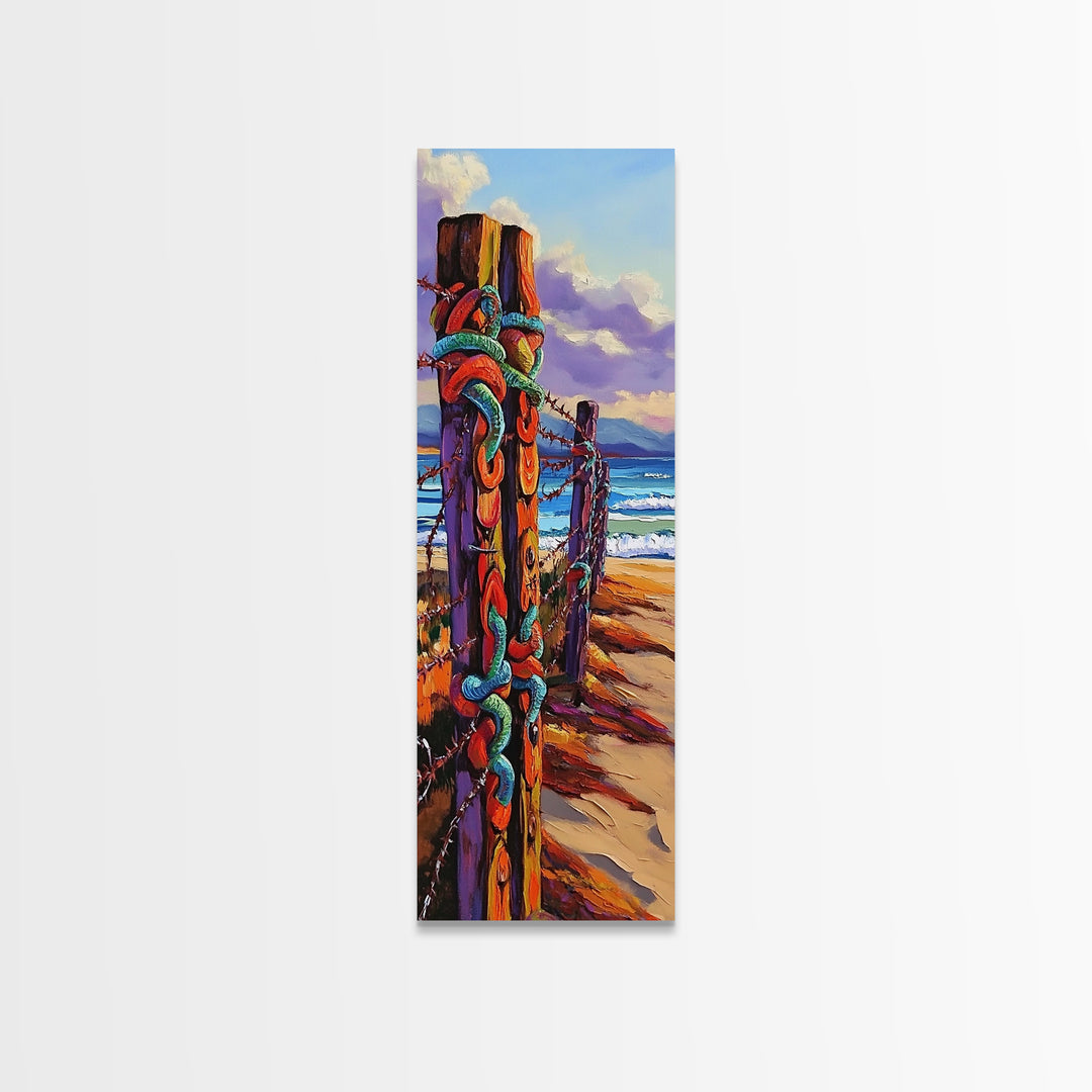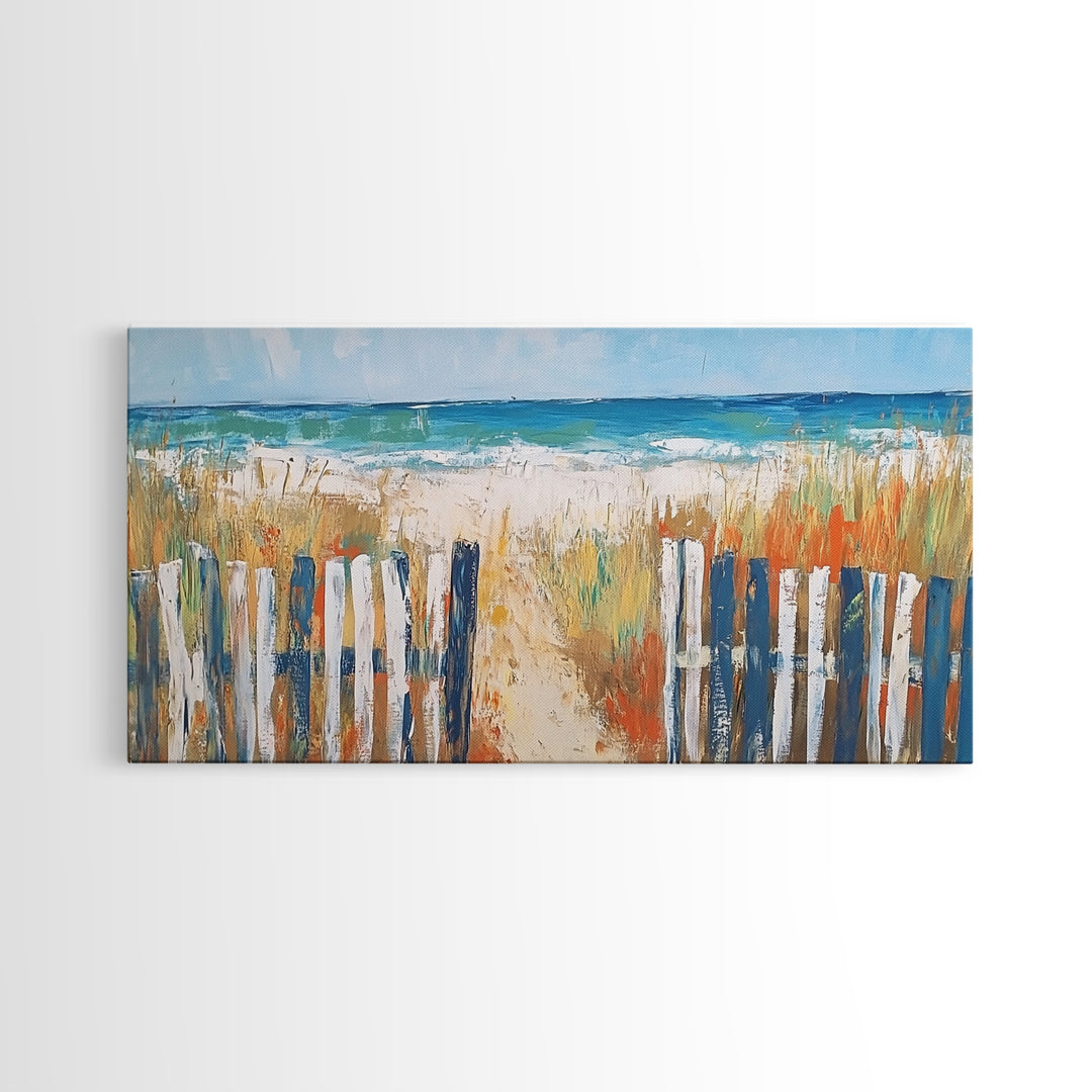 Beach Fence, coastal painting, framed canvas print, nautical decor, seascape painting, blue and green wall art, extra wide art
