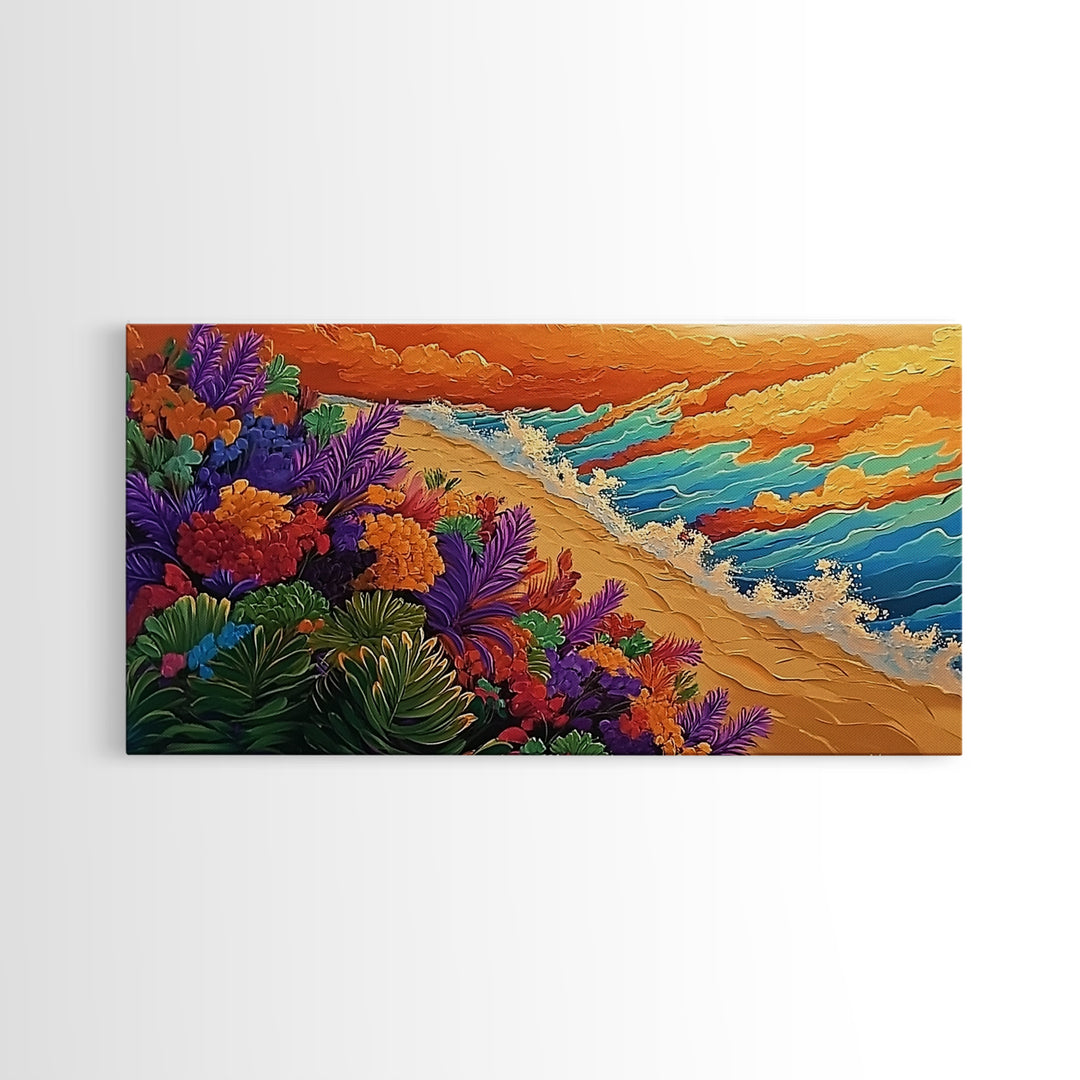 Beach Flowers, Sunset, Coastal Decor Canvas Print, Colorful Ocean Landscape, Tropical Boho Art, Living Room Beach Wall Art