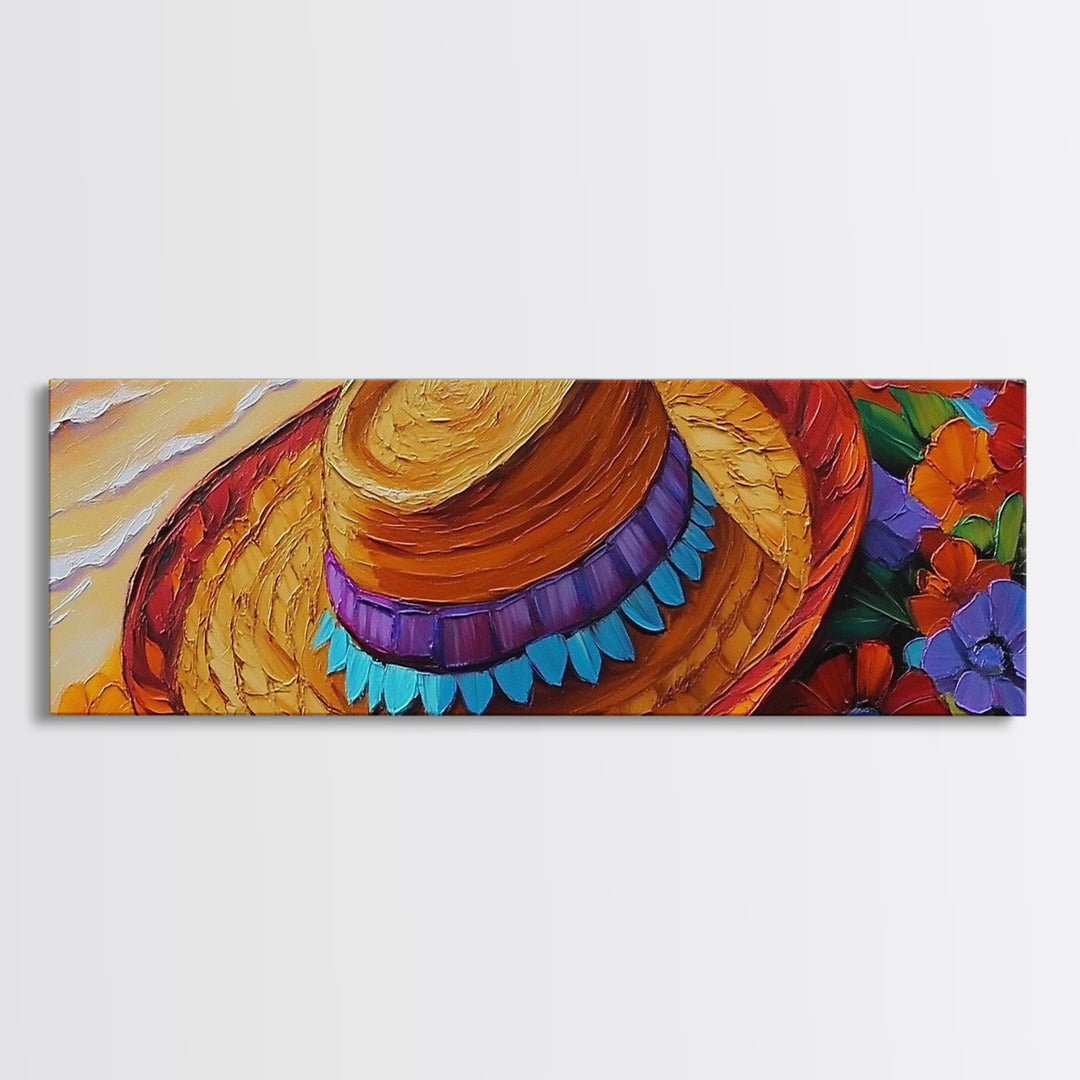 Beach Hat, Sunset Flowers, Colorful Vibes, Summer Decor, Canvas Print, Tropical Wall Art, Dining Room Accent, Floral Coastal Painting