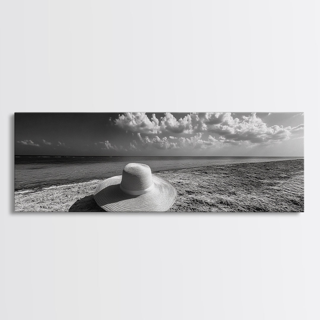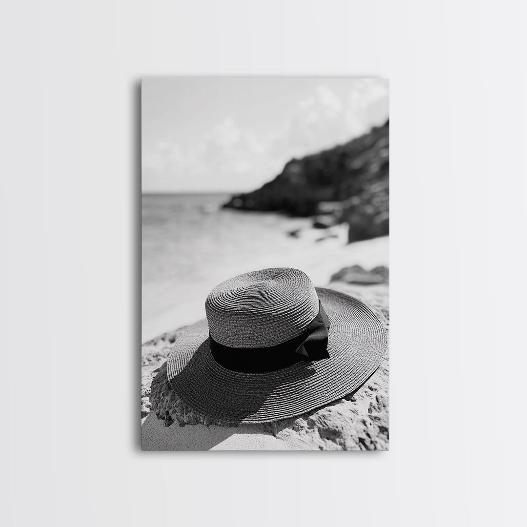 Beach Hat Closeup, Seaside Fashion, Coastal Breeze, Relaxed Mood, Framed Canvas Print, Minimalist Beach Art, Summer Home Decor