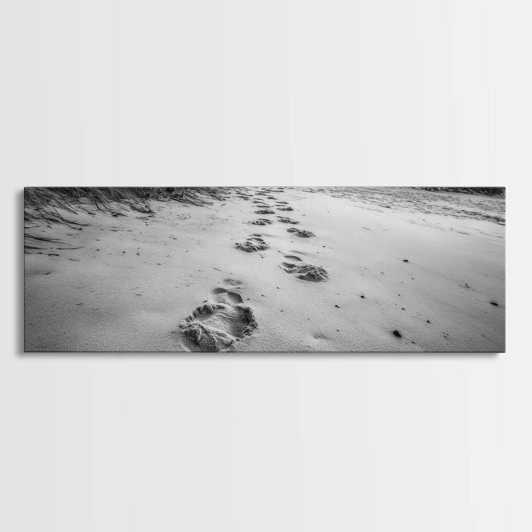 Beach Footprints, Sandy Path, Seaside Steps, Reflective Moment, Canvas Print, Minimalist Bathroom Wall Art, Tranquil Coastal Decor