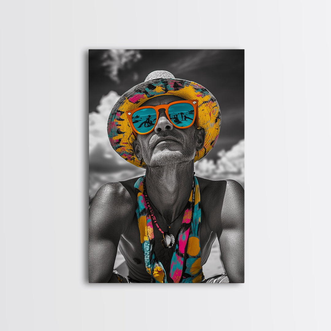 Beach Guy Portrait, Summer Sunglasses, Boho Vibe, Framed Canvas Print, Surf Shack Decor, Eclectic Wall Art, Travel Inspired Design