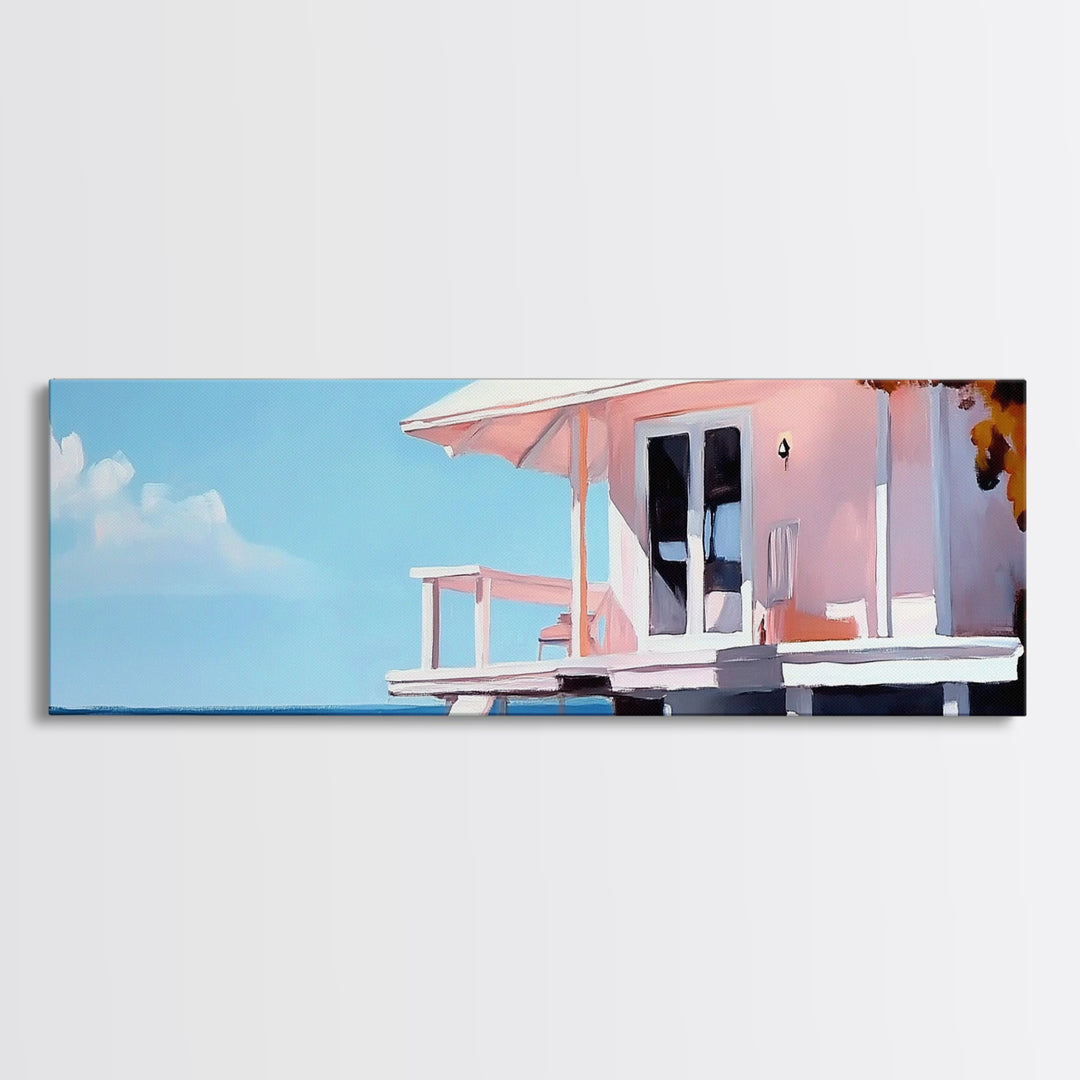 Beach House, Ocean View, Tropical Landscape, Framed Canvas Print, Coastal Art, Beach Wall Decor, Living Room Art, Boho Wall Art
