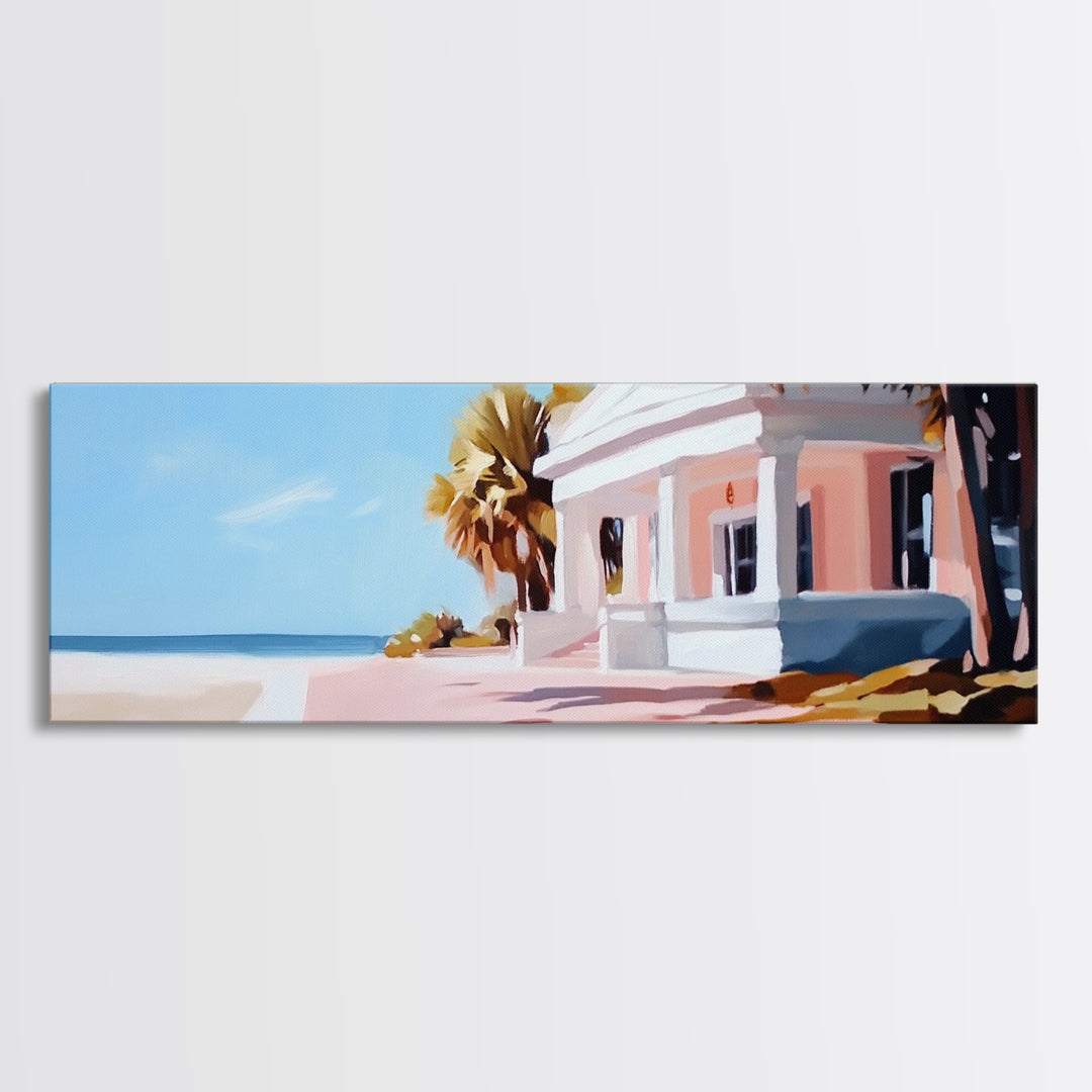 Beach House, Oceanfront Living, Coastal Home, Framed Canvas Print, Tropical Wall Art, Soft Pastel Aesthetic, Living Room Wall Art