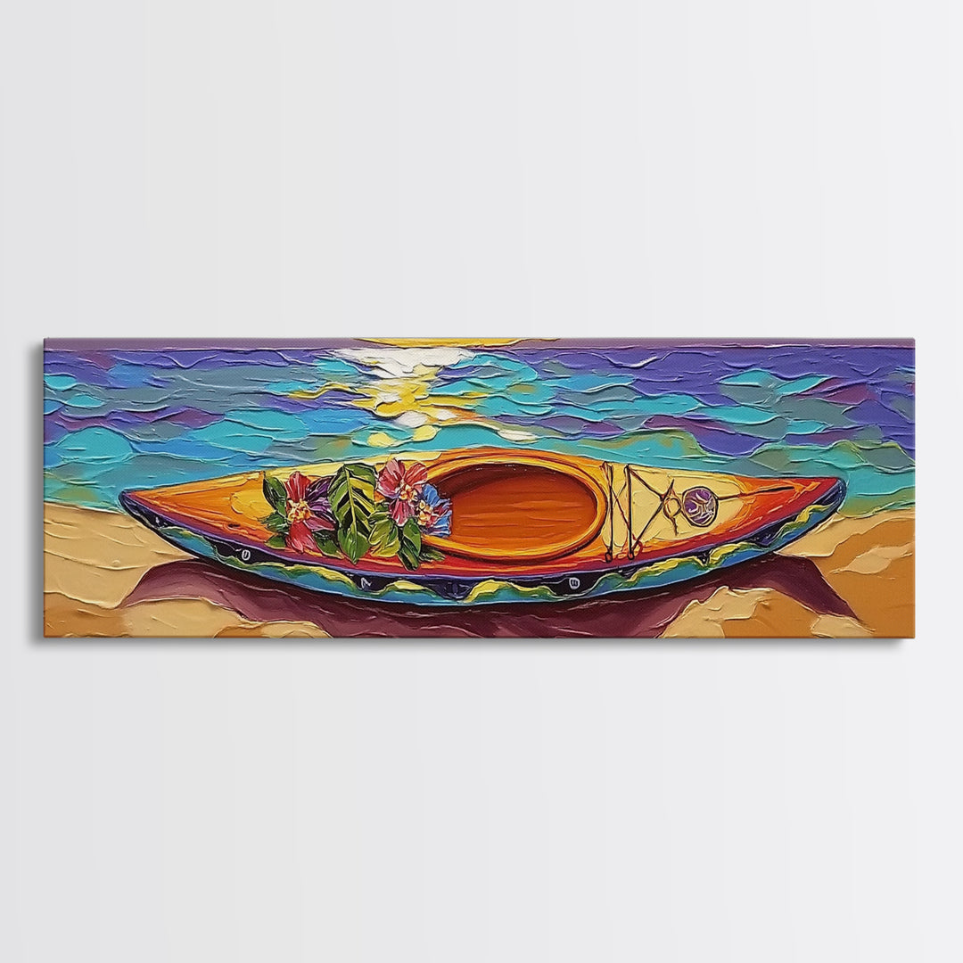 Beach Kayak Scene, Vibrant Shoreline Art, Floral Boat, Canvas Print, Nautical Bathroom Wall Art, Coastal Summer Decor, Colorful Seascape