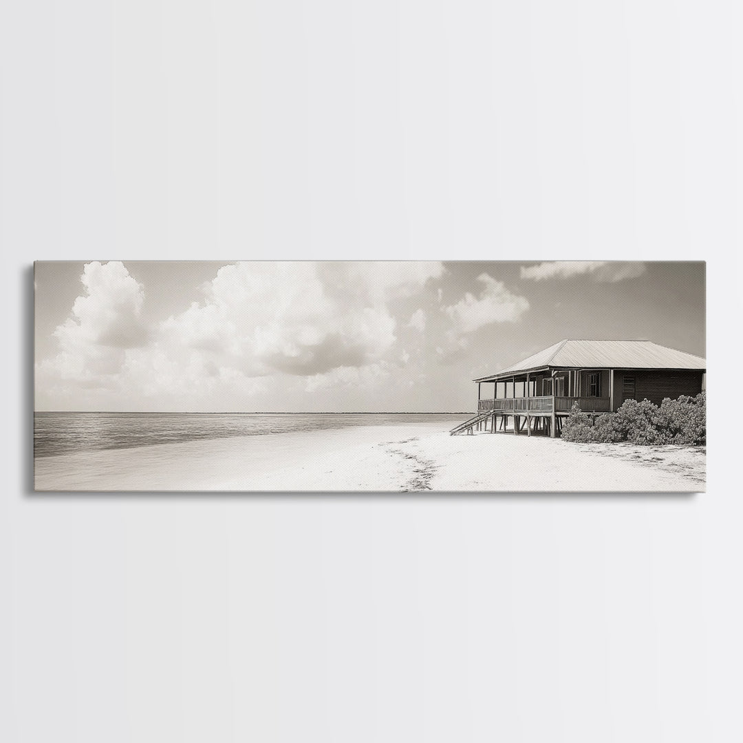 Beach House, Secluded Shore, Calm Waters, Framed Canvas Print, Coastal Wall Art, Minimalist Living Room Decor, Vacation Vibes