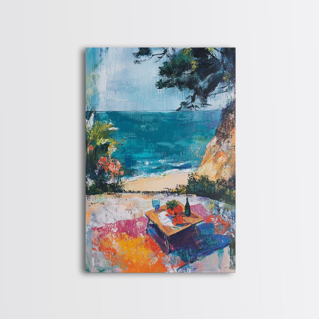 Beach Picnic, Seaside Dining, Summer Wall Art, Framed Canvas Print, Coastal Decor, Relaxing Atmosphere, Kitchen Art, Nautical Aesthetic