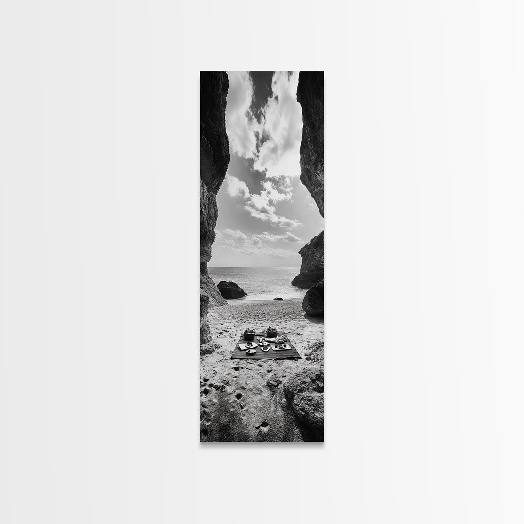 Beach Picnic, Seaside Cave, Ocean View, Framed Canvas Print, Minimalist Coastal Art, Dining Room Decor, Romantic Escape Vibes, Nautical Decor