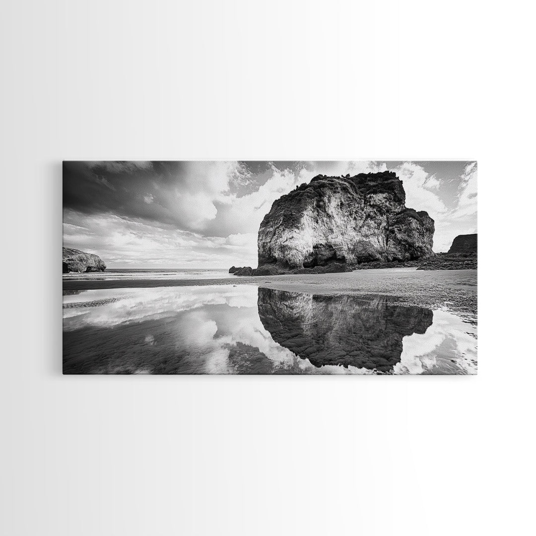 Beach Reflection, Seaside Rock, Cloudy Horizon, Coastal View, Framed Canvas Print, Minimalist Wall Art, Bathroom Ocean Decor