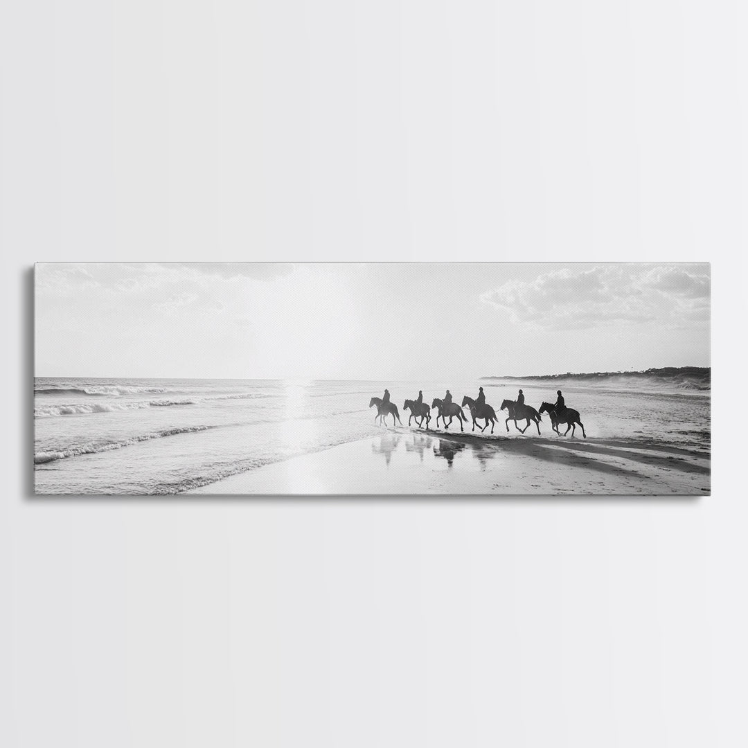 Beach Riders, Horseback Freedom, Seaside Journey, Canvas Print, Monochrome Wall Art, Coastal Living Room Decor, Nature Photography