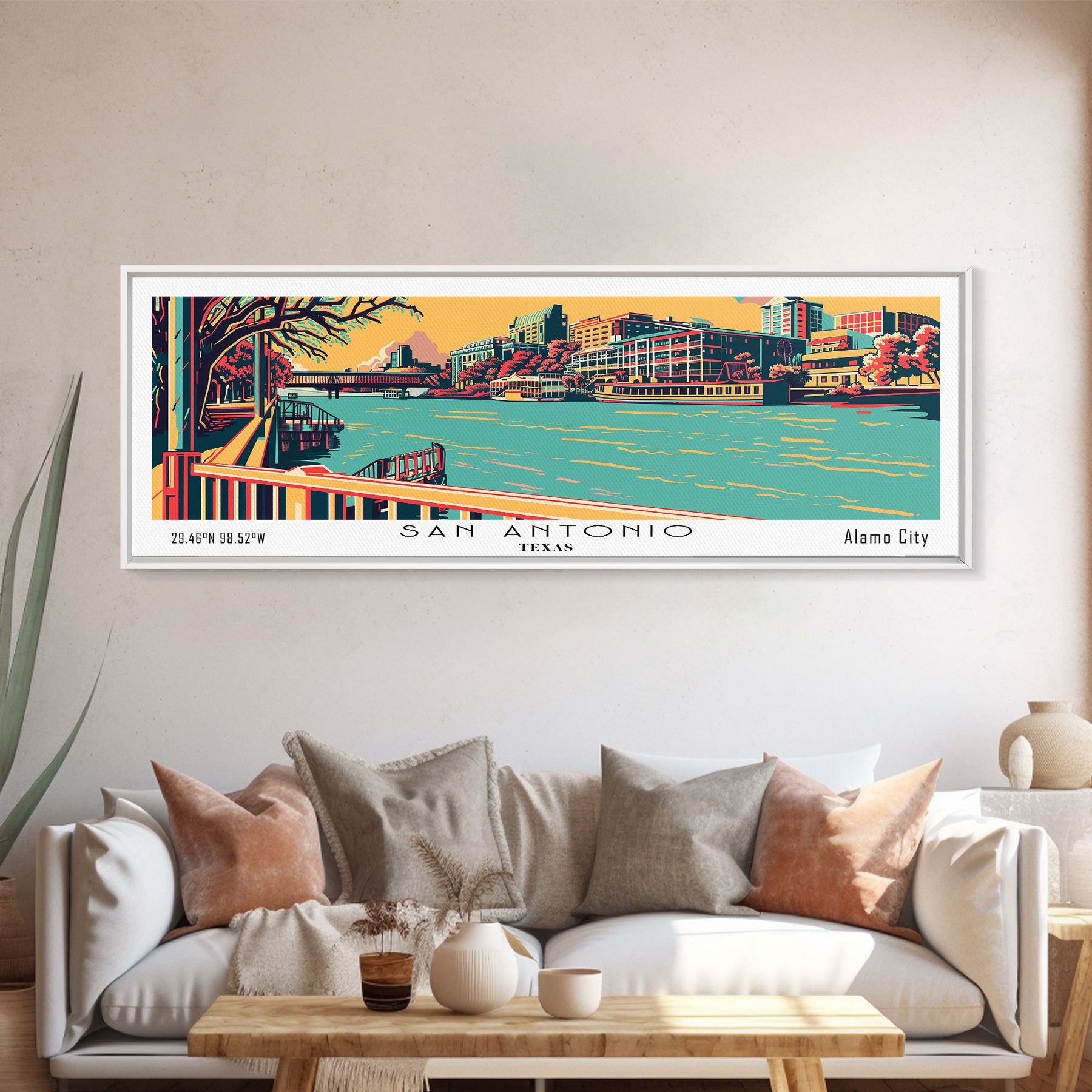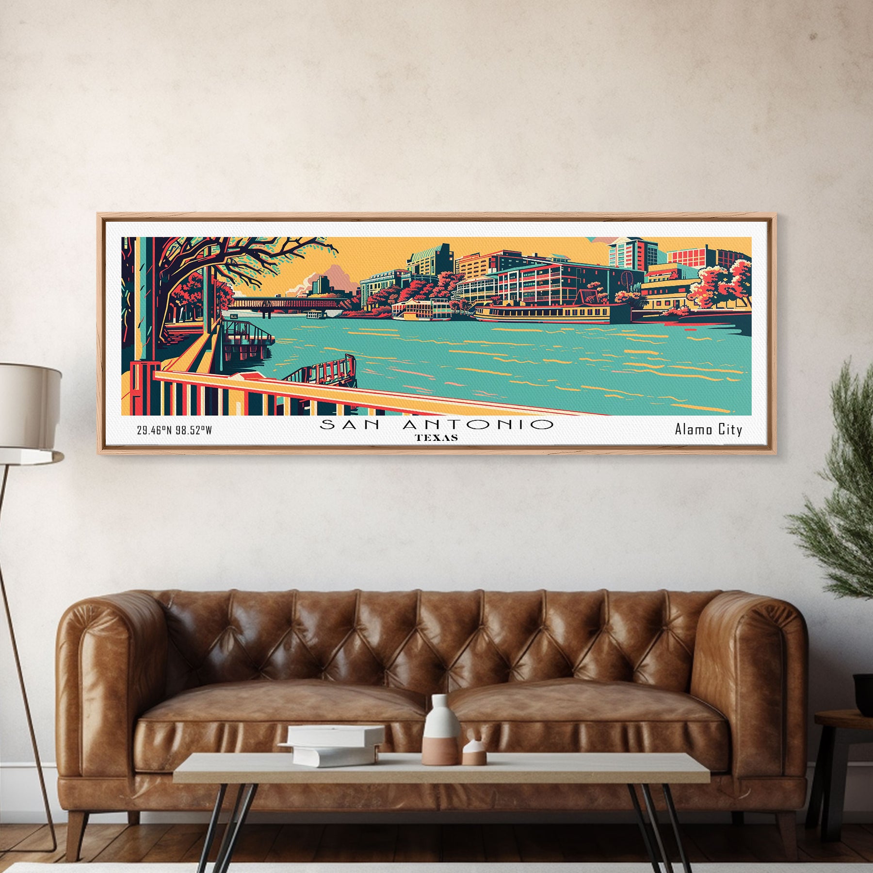 San Antonio Texas Panoramic Wall Art Framed Canvas Print, Travel Poster, Mid Century Modern Art, Pop Art Style, Home Decor, Office Art