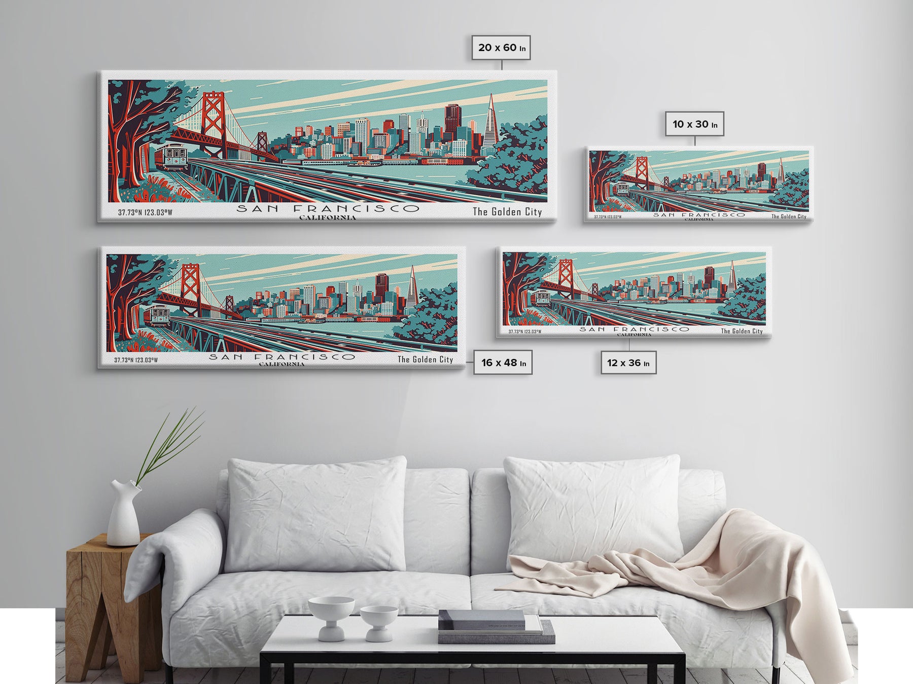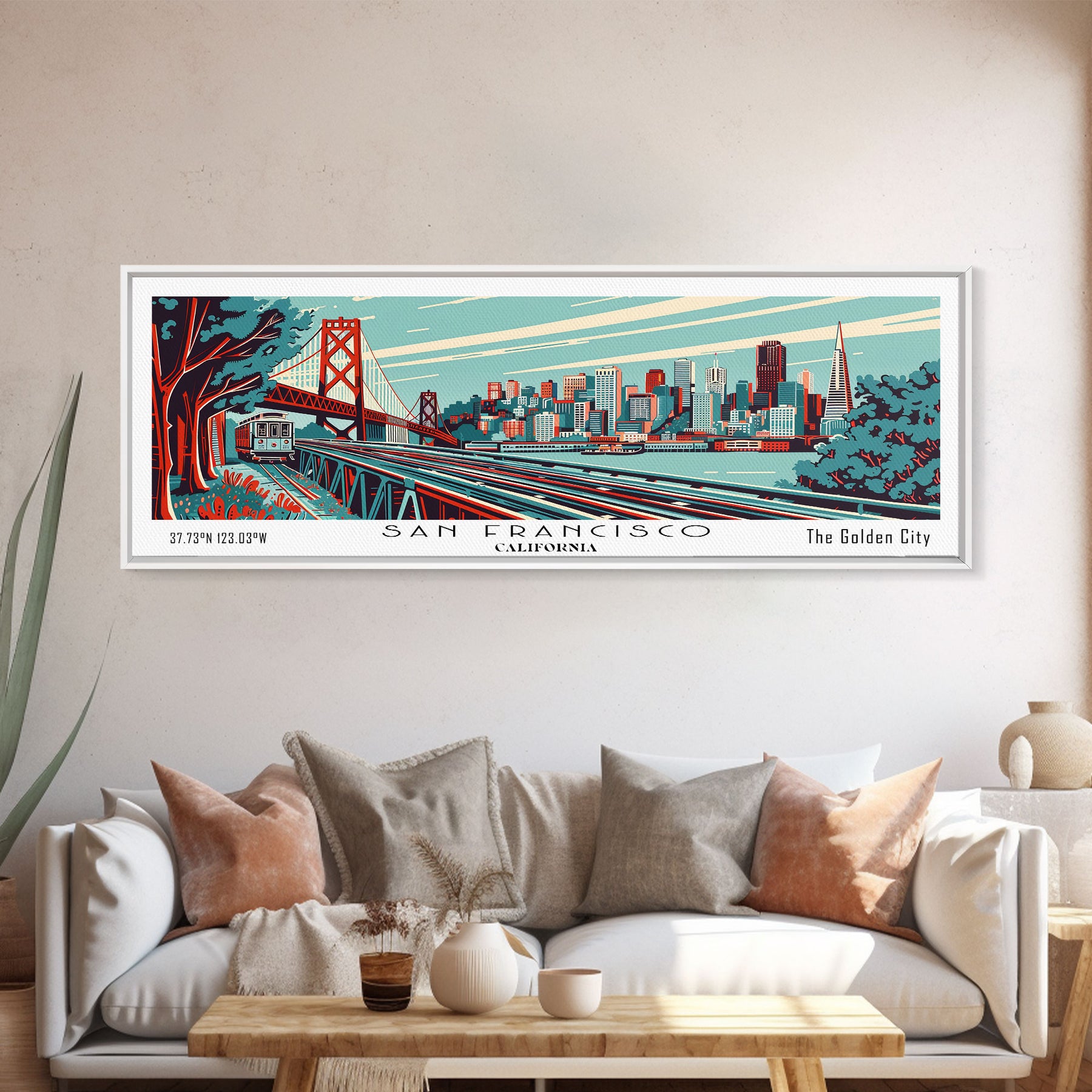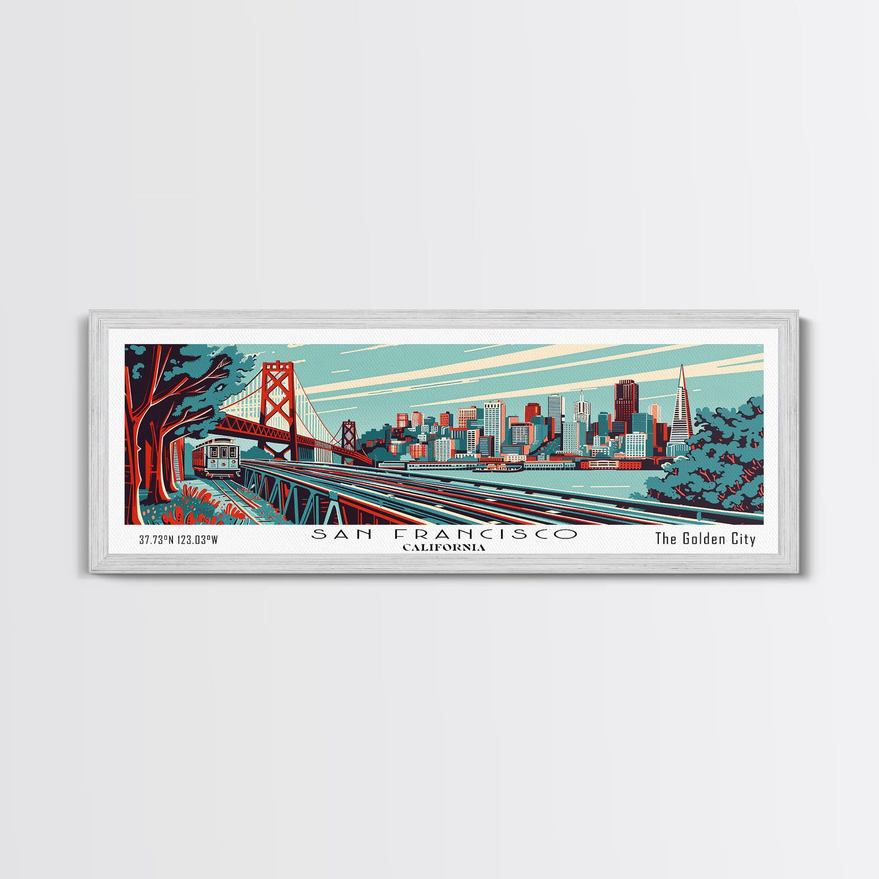 San Francisco California Panoramic Travel Poster Framed Canvas Print, Mid Century Modern Art, Pop Art Style, Wall Art, Home Decor, Retro Style Art