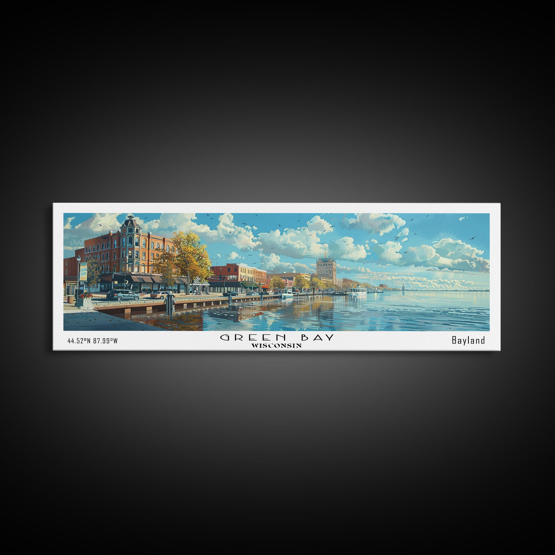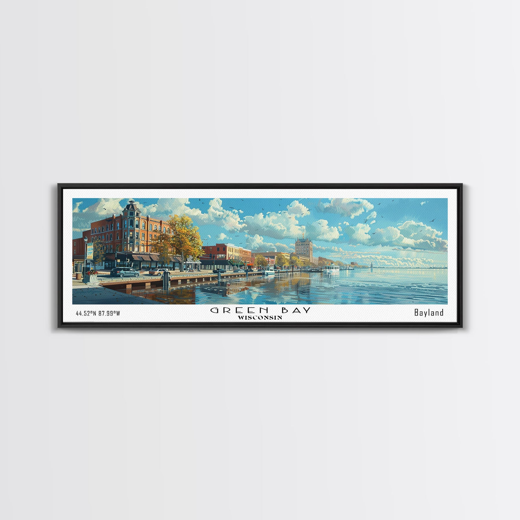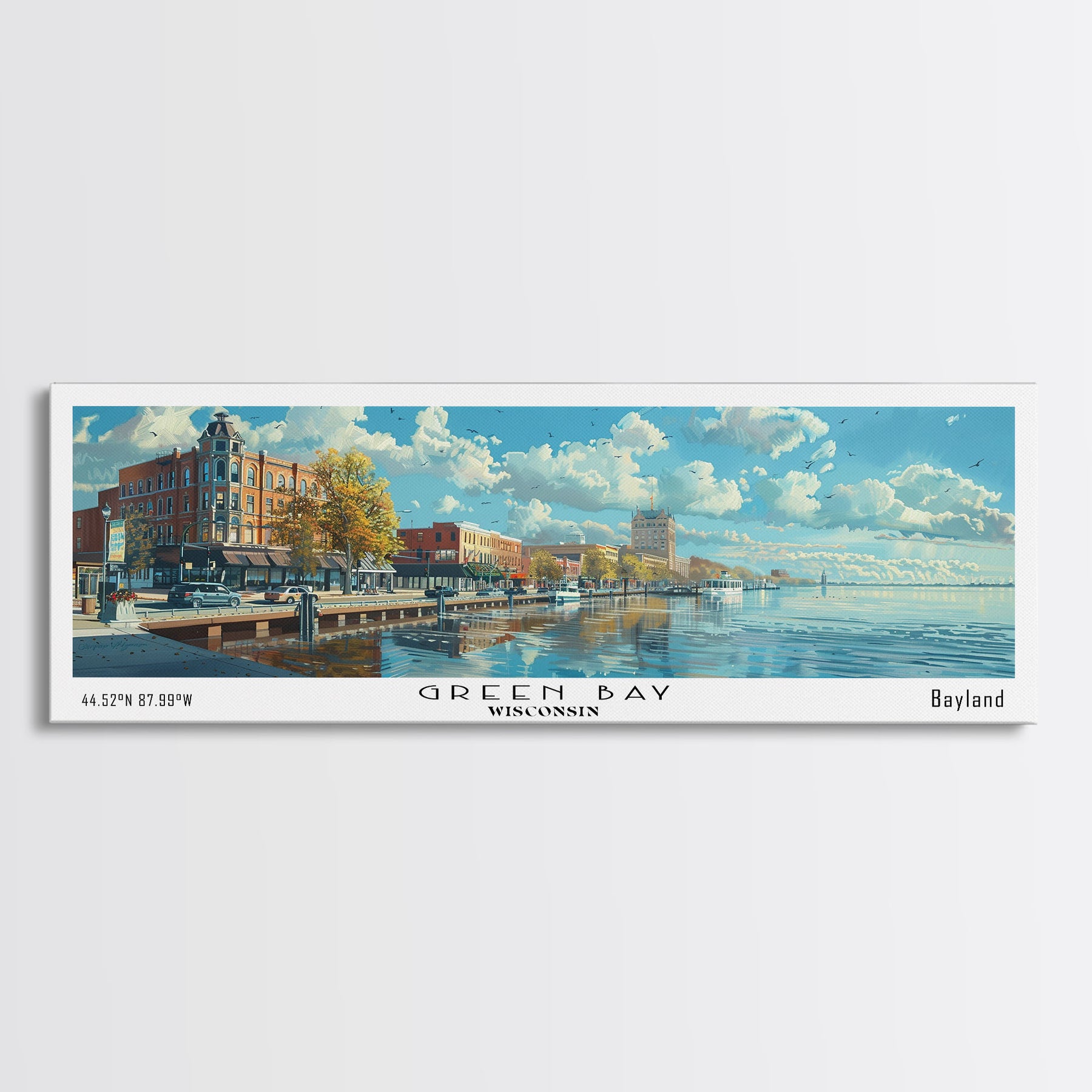 Green Bay Wisconsin Panoramic Watercolor Painting, Urban Framed Canvas Print, Cityscape Wall Art for Office, Travel Decor, Home Gift Idea