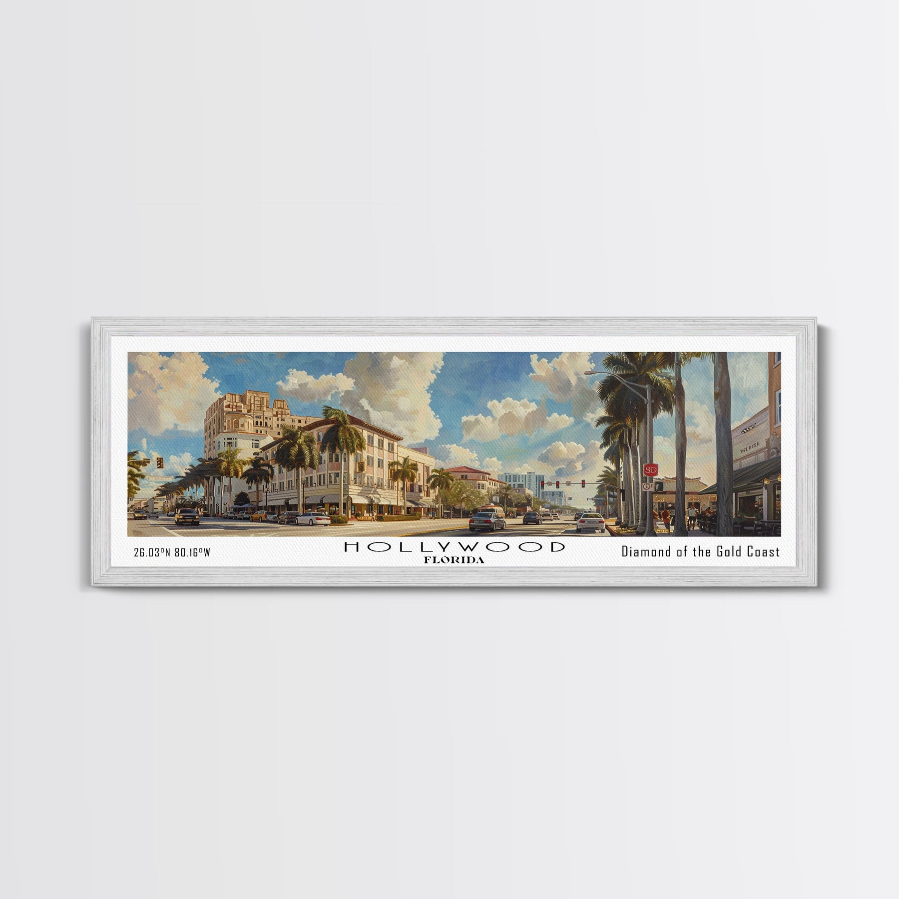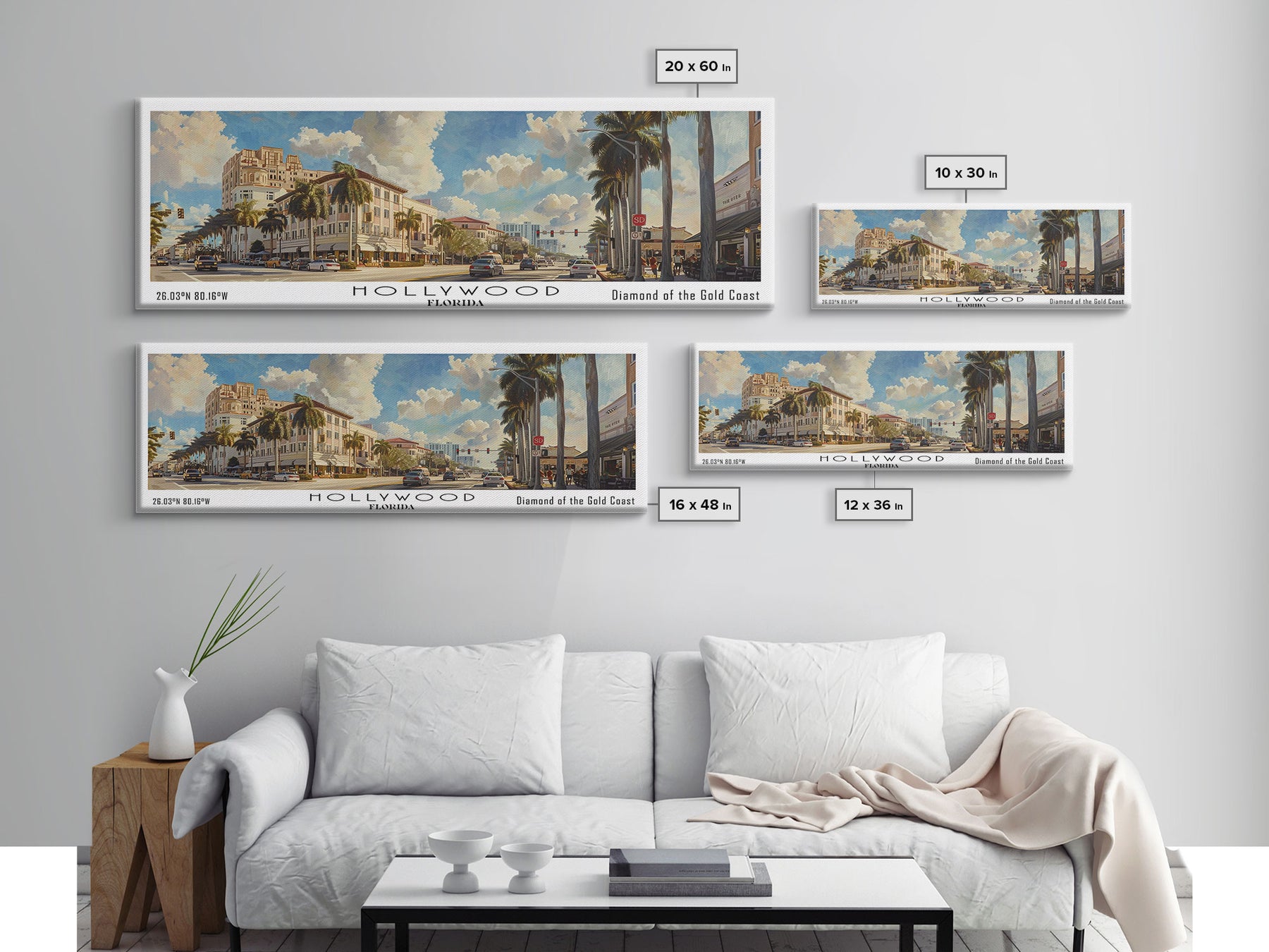 Hollywood Florida Panoramic Watercolor Painting, Urban Framed Canvas Print, Cityscape Wall Art for Living Room, Travel Poster, Home Decor, City Gift Idea