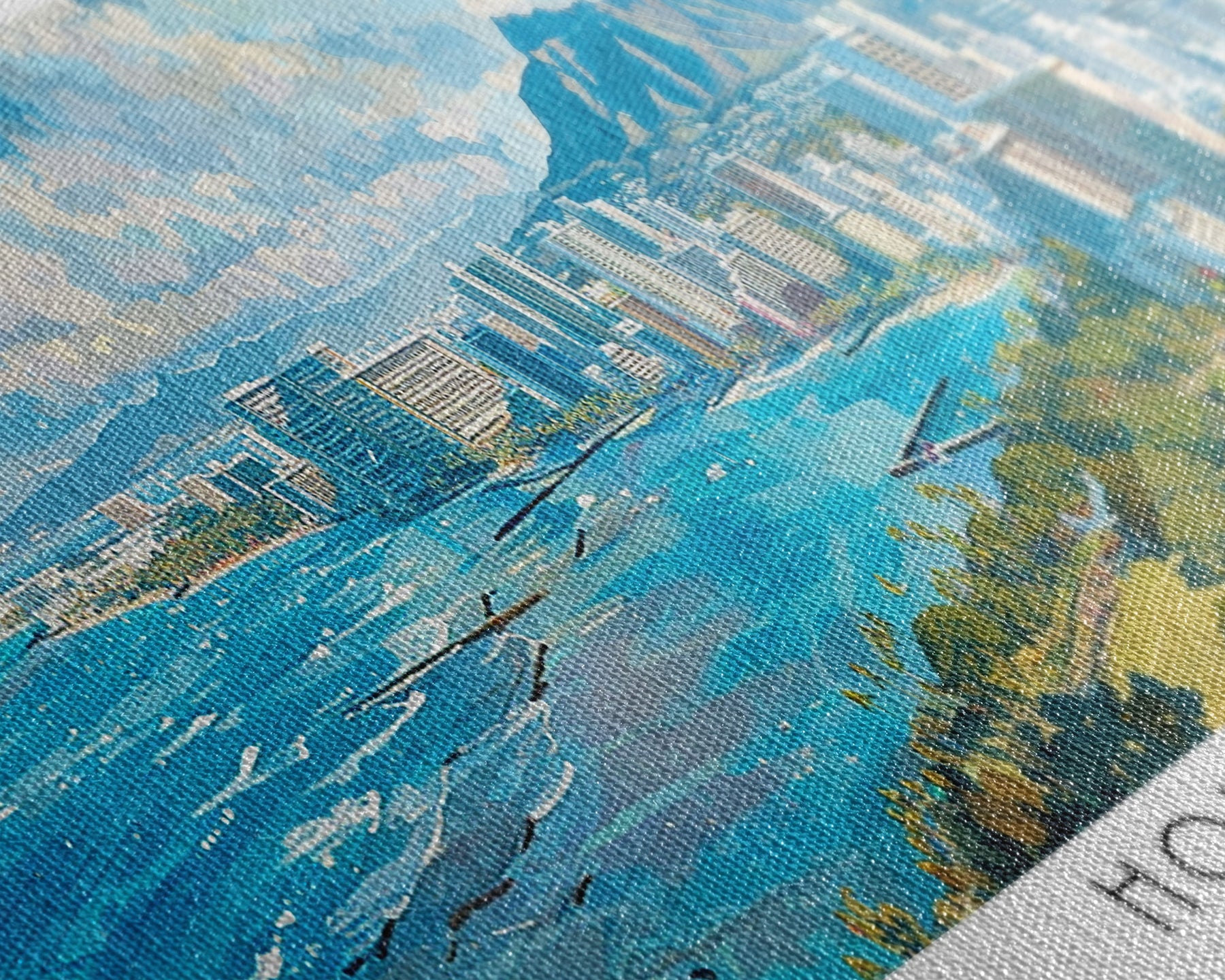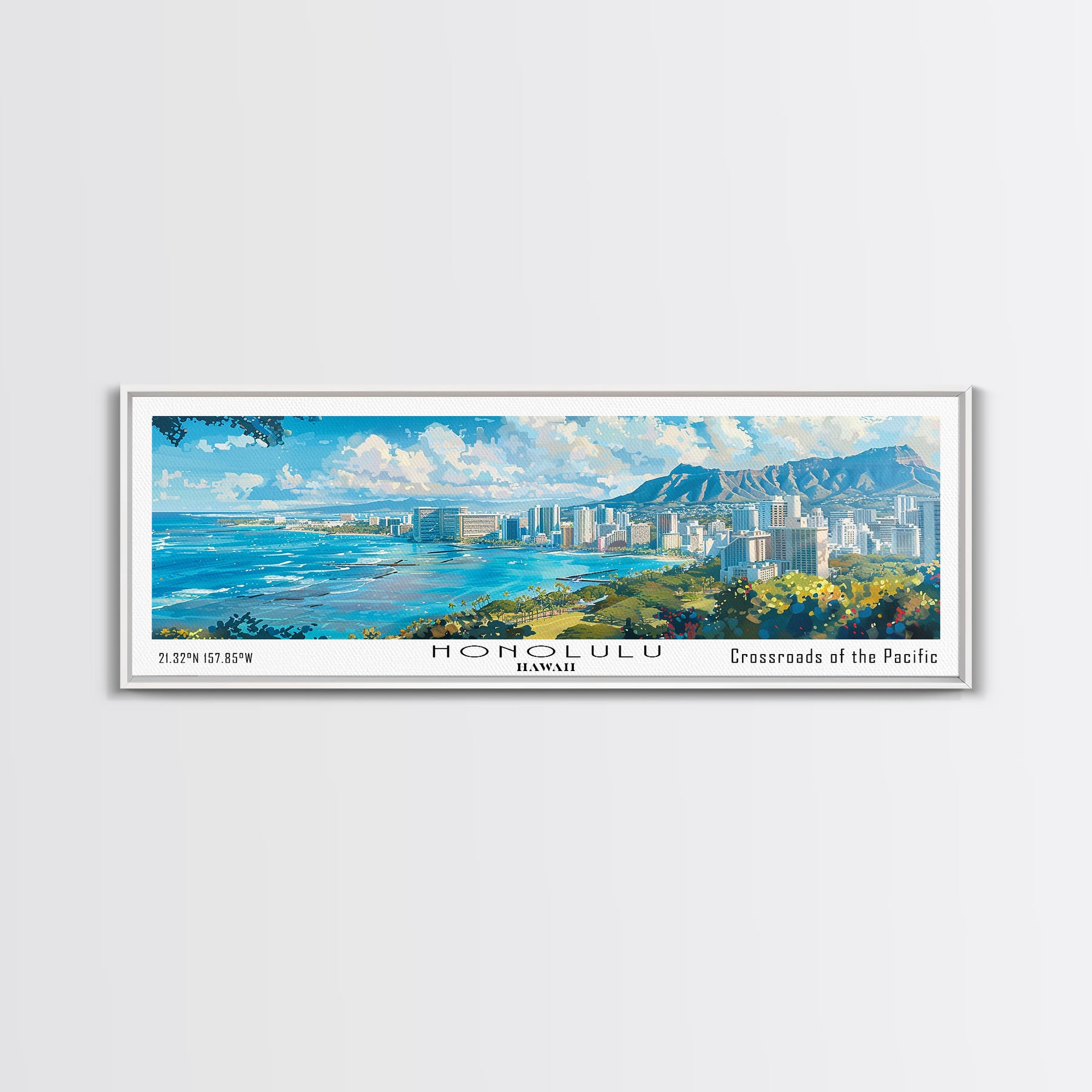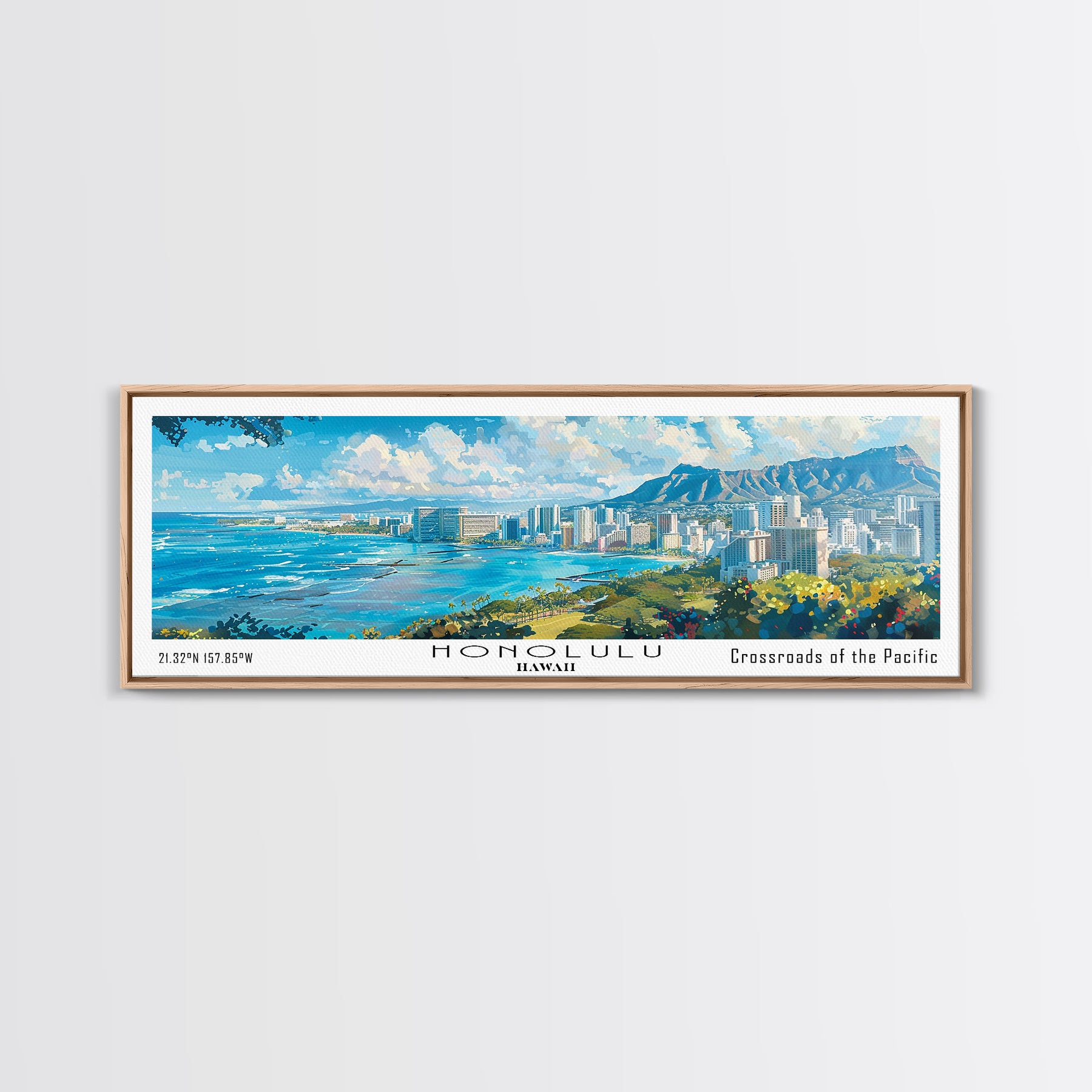 Honolulu Hawaii Panoramic Watercolor Painting, Urban Framed Canvas Print, Cityscape Wall Art for Living Room, Travel Poster, Home Decor, City Gift Idea