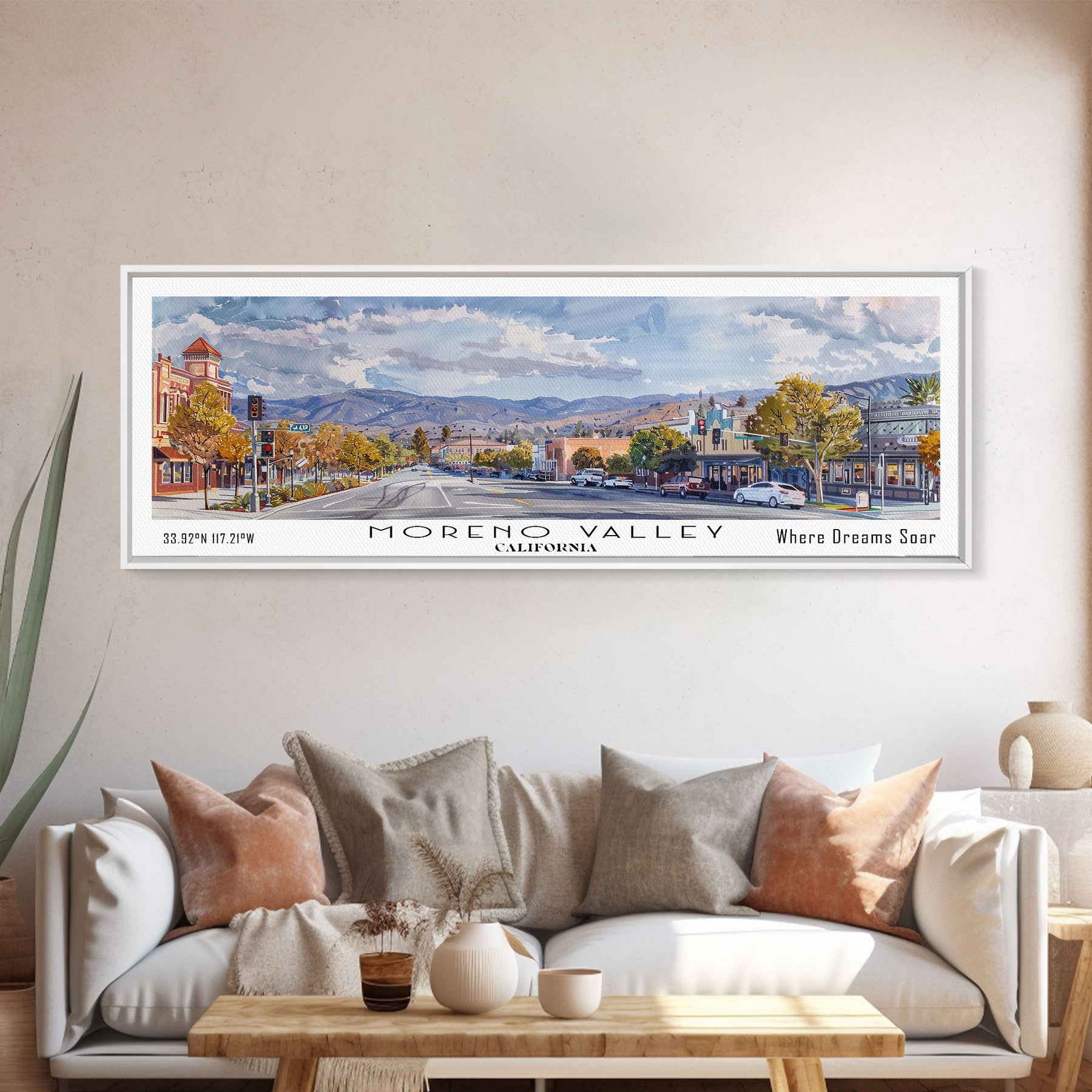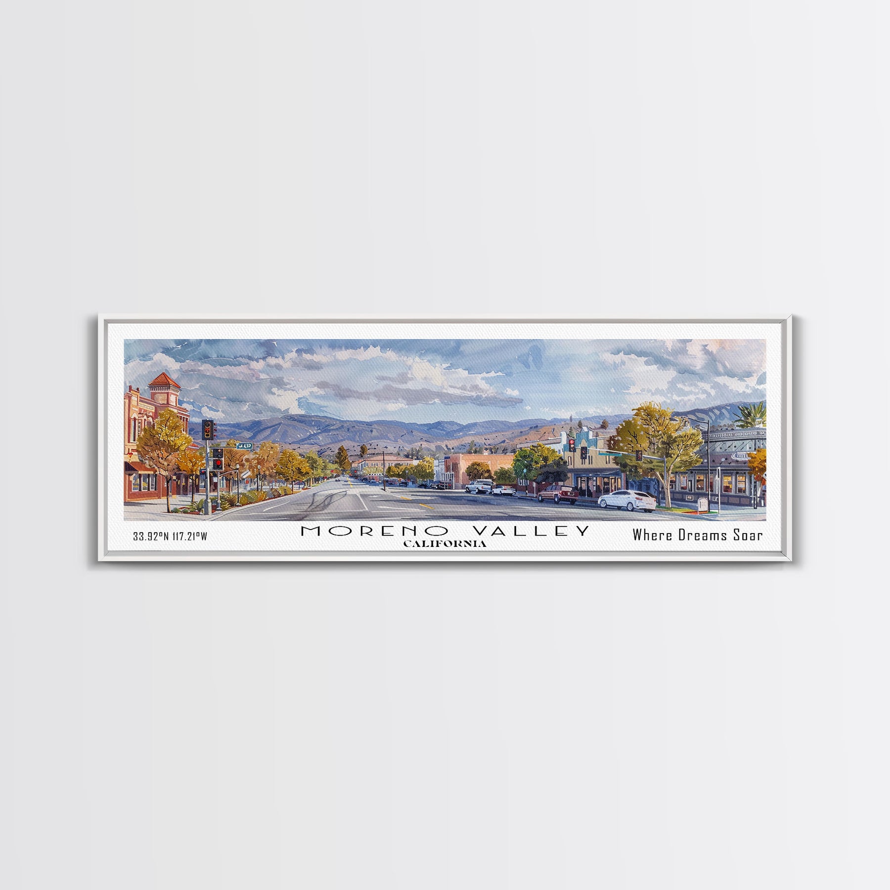 Moreno Valley California Panoramic Framed Canvas Print, Watercolor Cityscape, Office Wall Art, Travel Poster, Living Room Decor, City Art