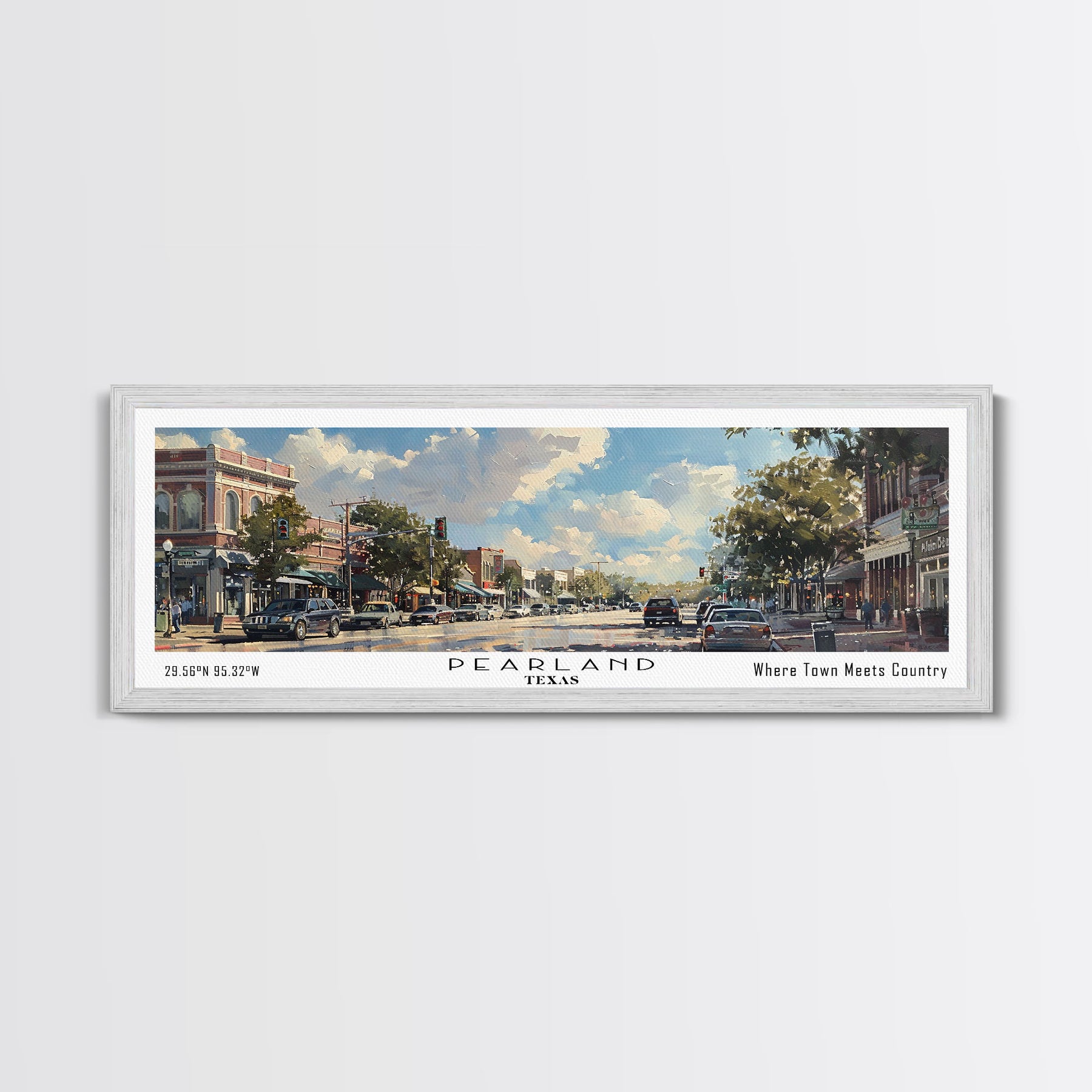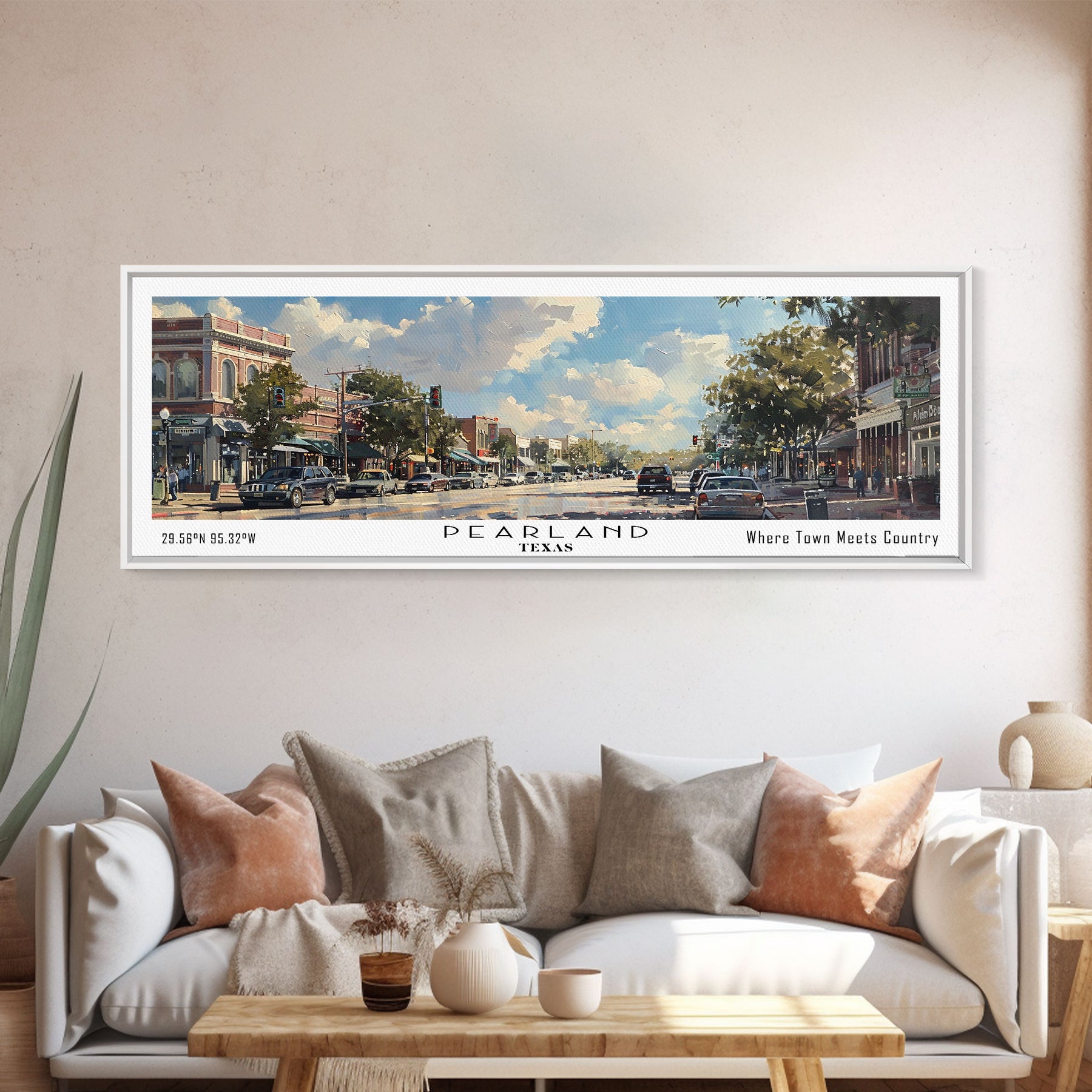 Pearland Texas Panoramic Framed Canvas Print, Cityscape Watercolor Painting, Travel Poster for Home Decor, Urban Art, Unique Gift Idea