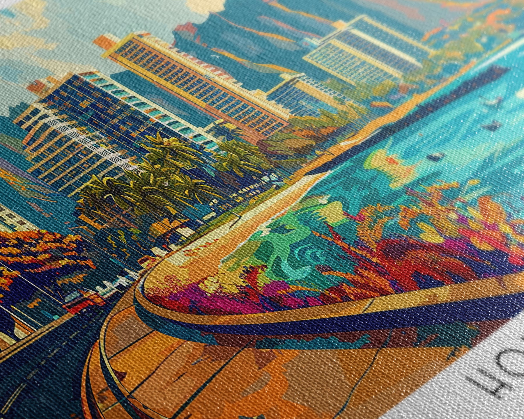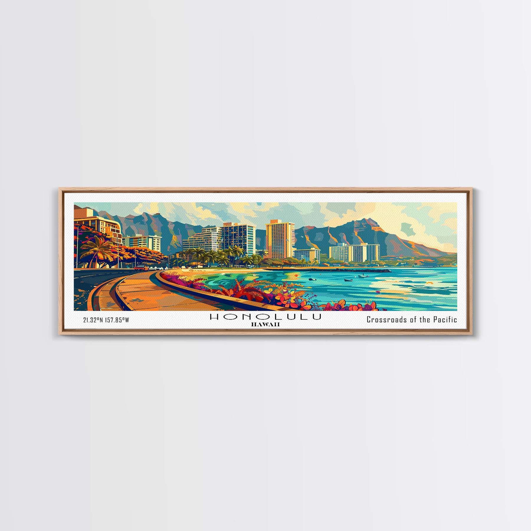 Honolulu Hawaii Panoramic Wall Art Framed Canvas Print, Mid Century Modern Art, Pop Art Style, Travel Poster, Home Decor, Retro Style