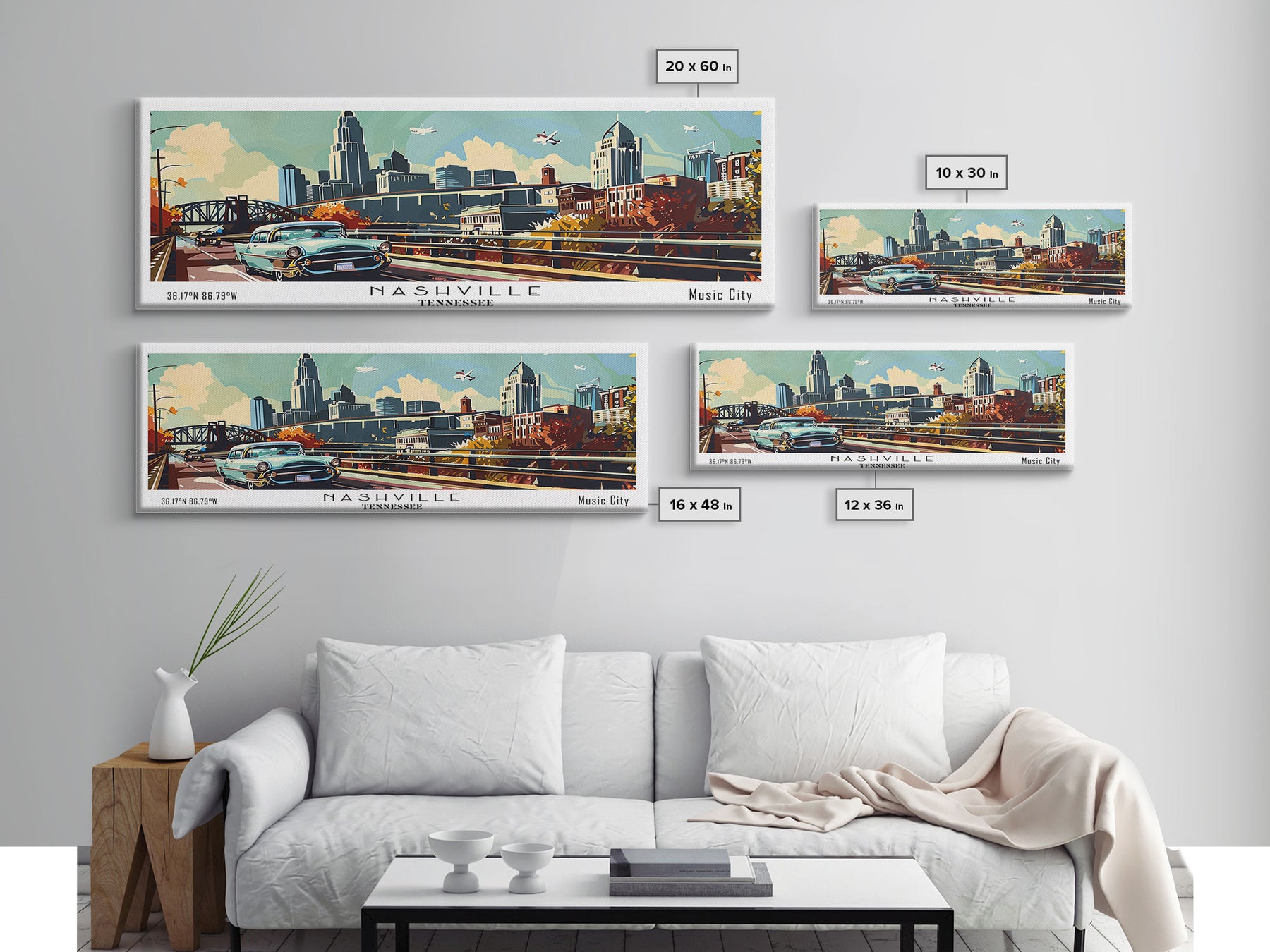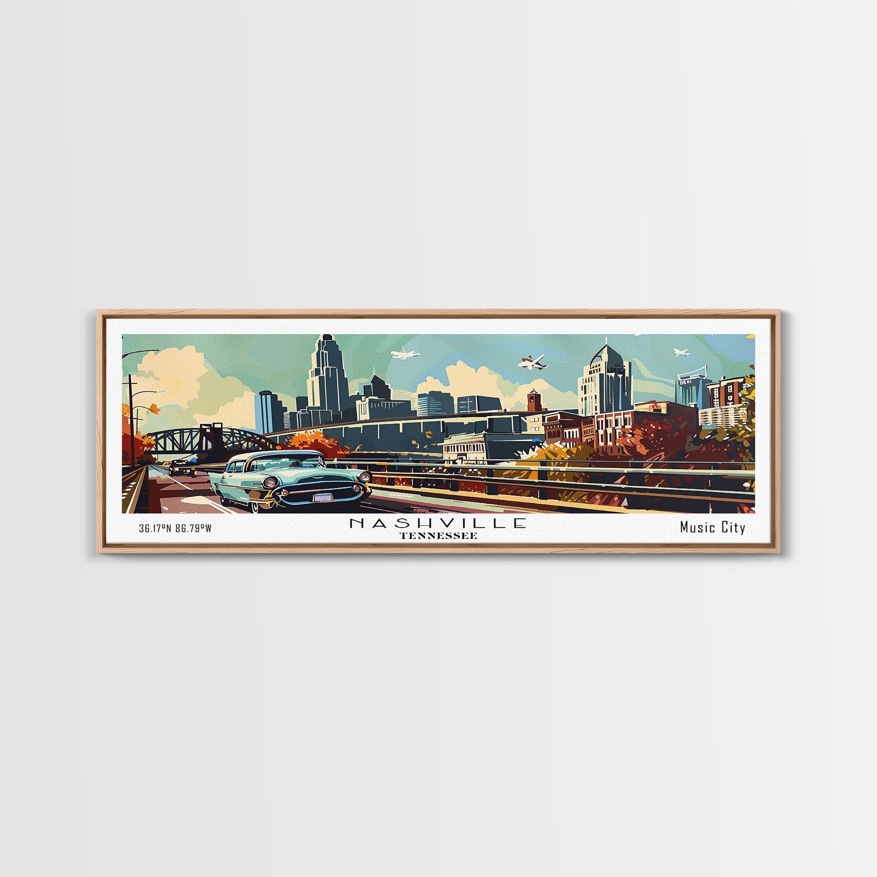 Nashville Tennessee Panoramic Painting, Mid Century Modern Framed Canvas Print, Retro Pop Art Travel Poster, Living Room Art, Home Decor, Office Wall Art, Vintage Style