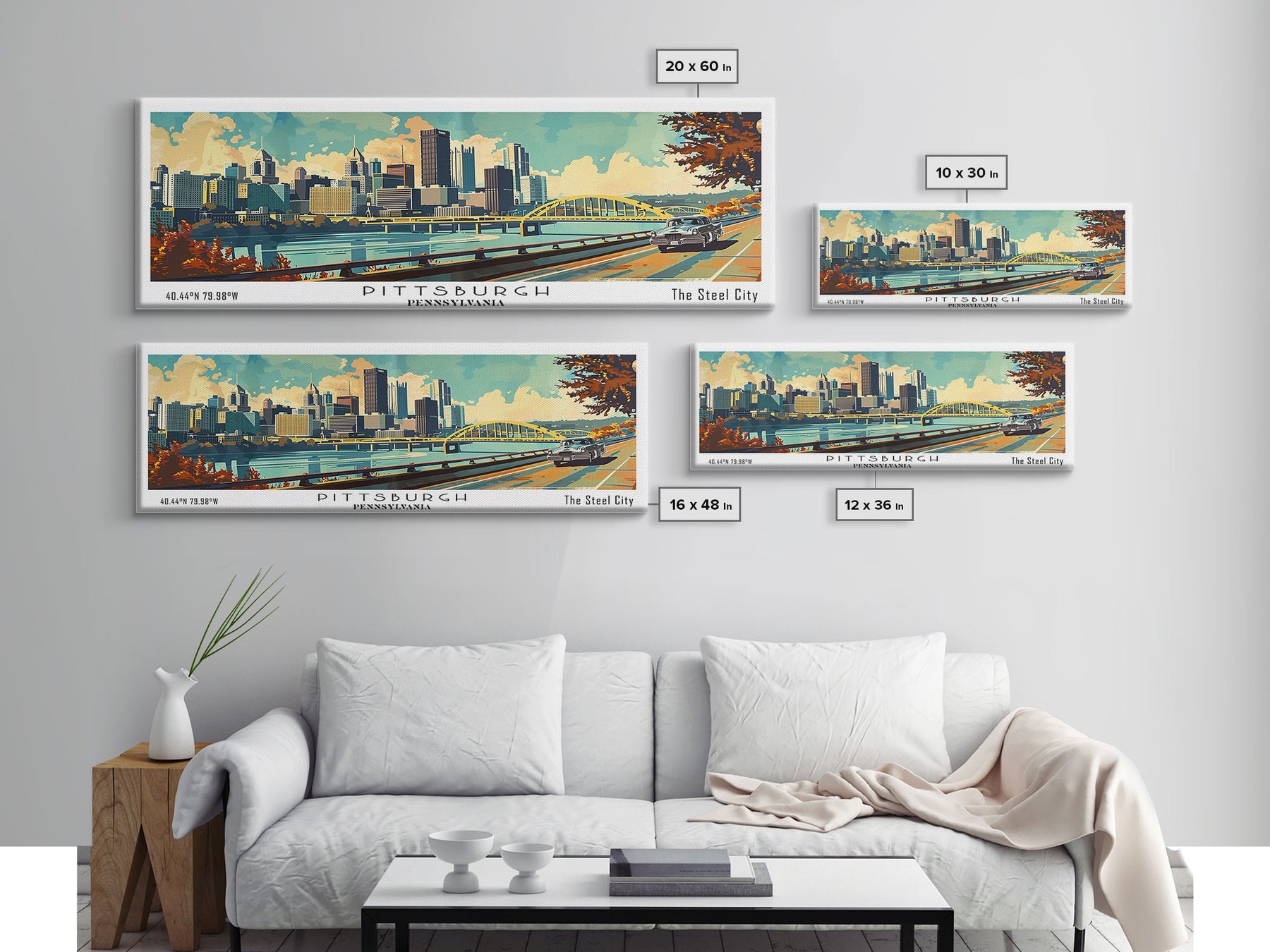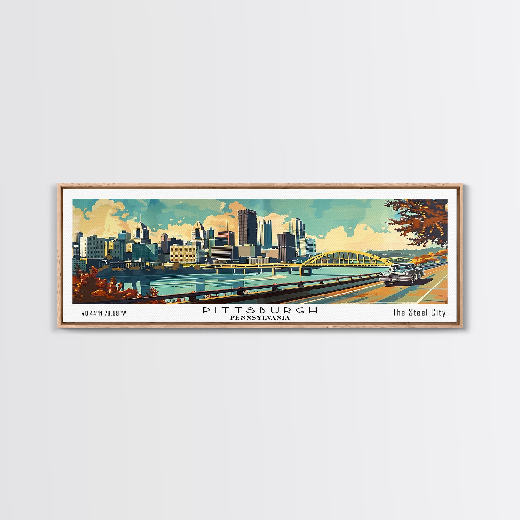Pittsburgh Pennsylvania Panoramic Wall Art, Mid Century Modern Framed Canvas Print, Retro Pop Art Travel Poster, Living Room Decoration
