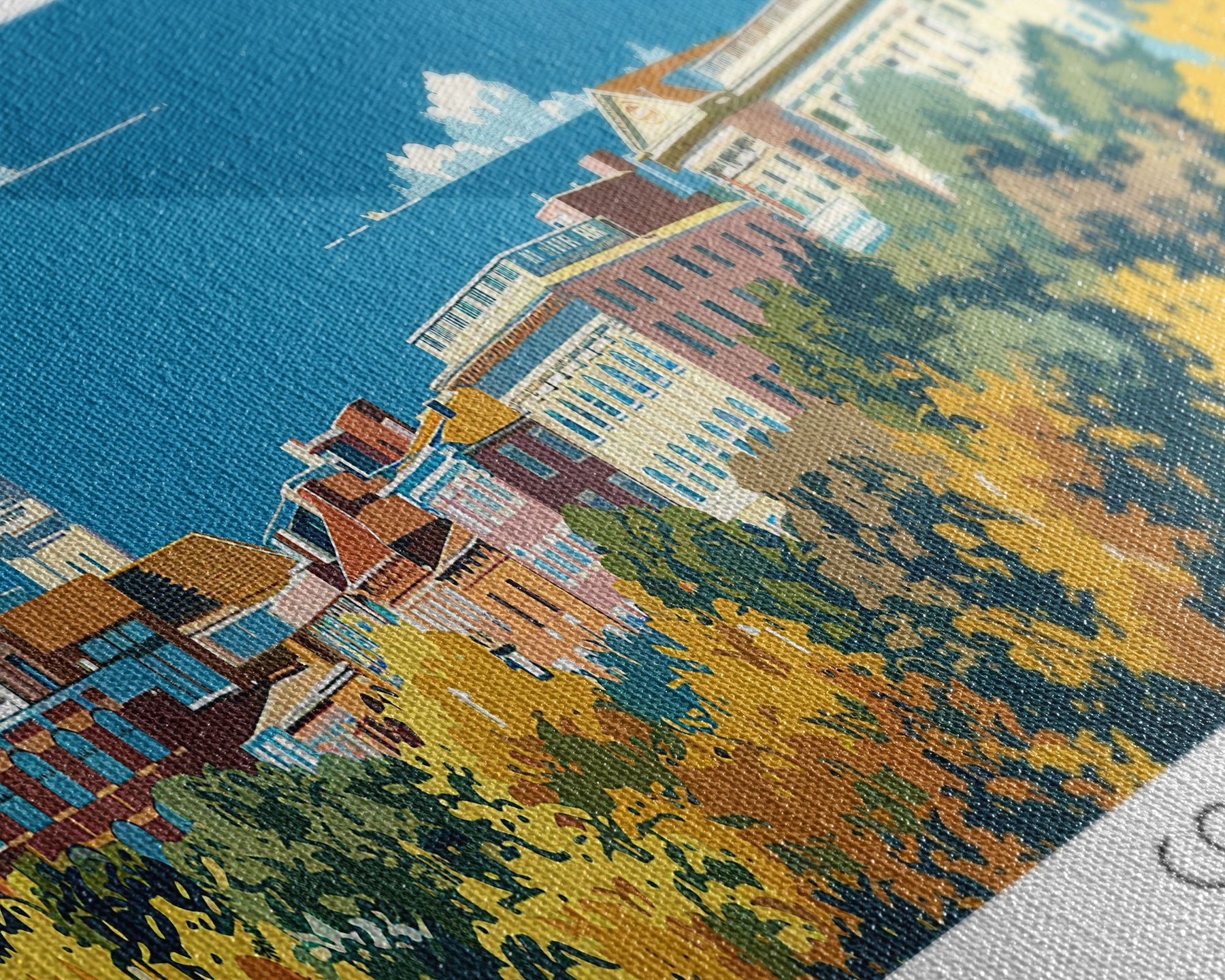 Most of our canvases are made in the USA, with the exception of canvases ordered with the light oak unstained frames, and any large canvases (24x48, 30x60, 16x48 and 20x60) ordered WITH a frame. These are temporarily made in and shipped from Europe, while we try to find a more consistent supplier in the USA.