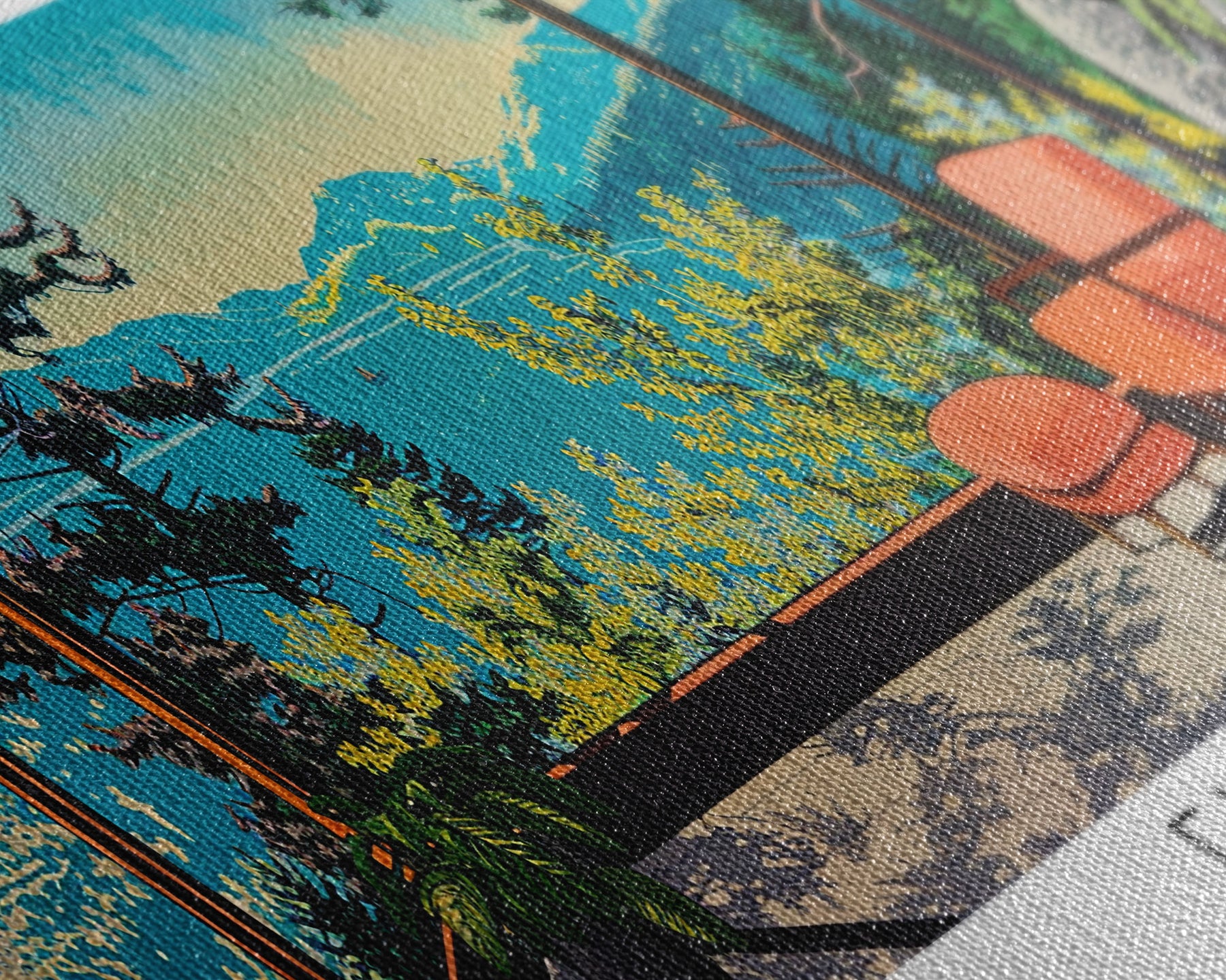 Most of our canvases are made in the USA, with the exception of canvases ordered with the light oak unstained frames, and any large canvases (24x48, 30x60, 16x48 and 20x60) ordered WITH a frame. These are temporarily made in and shipped from Europe, while we try to find a more consistent supplier in the USA.