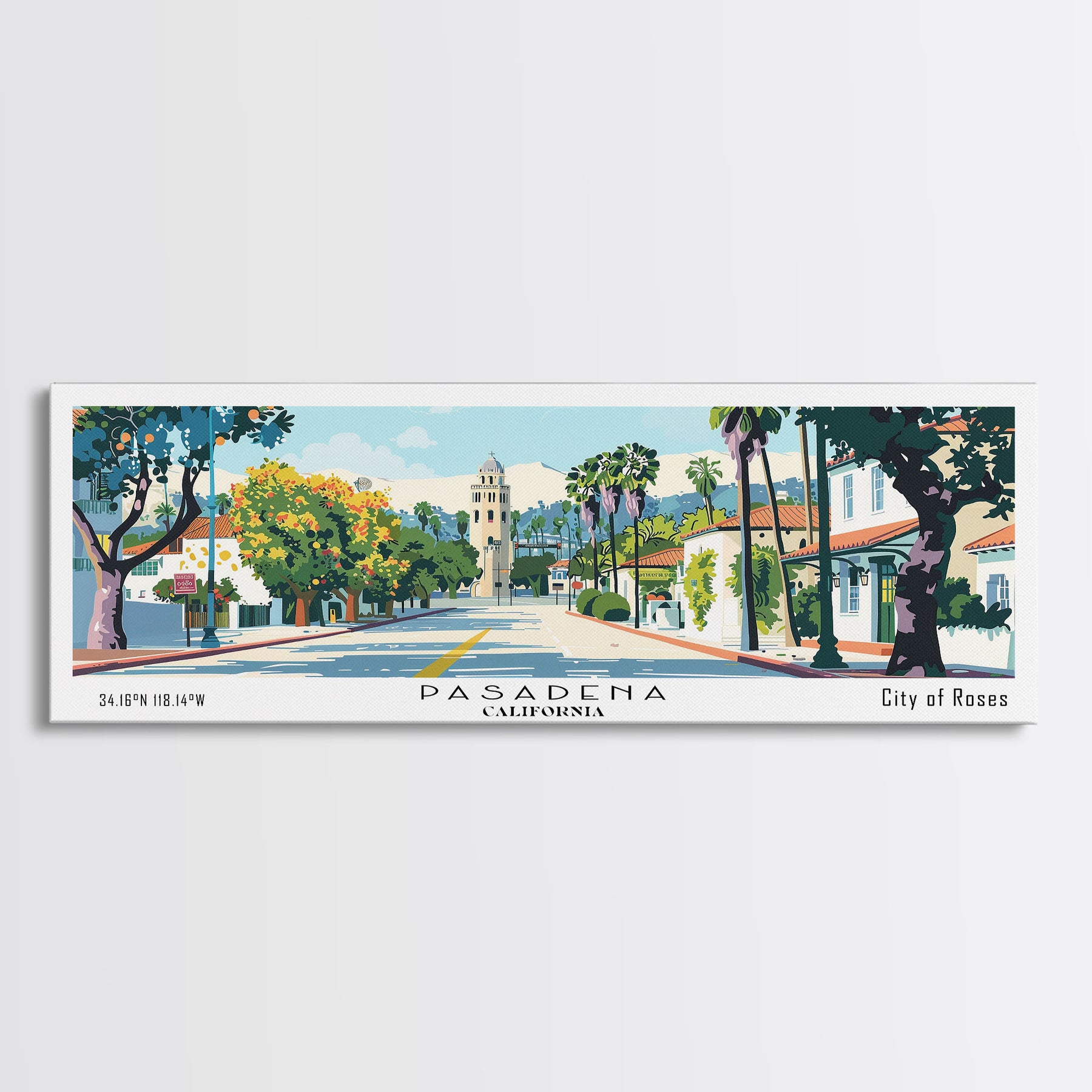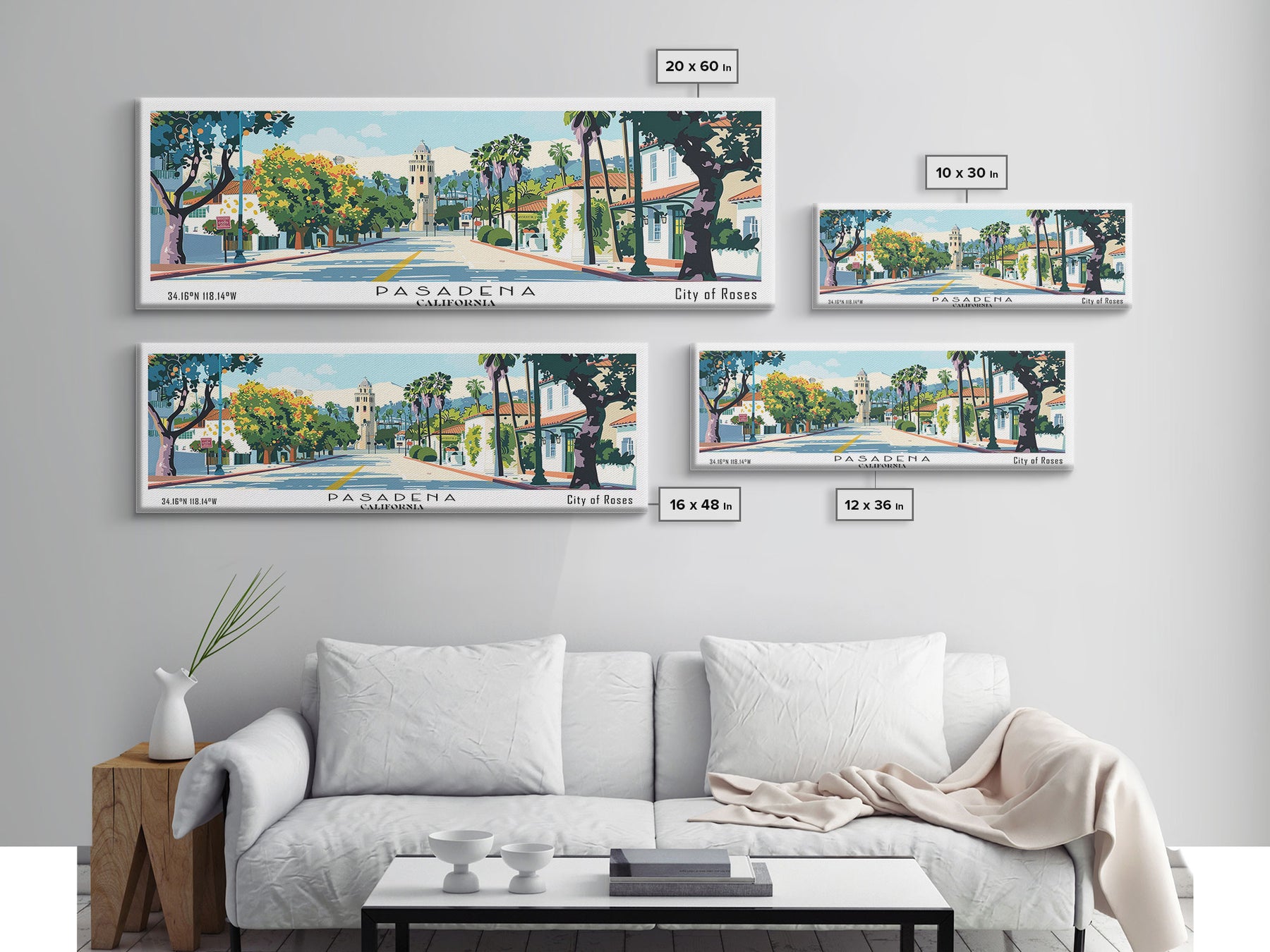 Pasadena California Panoramic Painting, Mid Century Modern Framed Canvas Print, Retro Pop Art Travel Poster, City Art, Office Wall Decor, Living Room Art