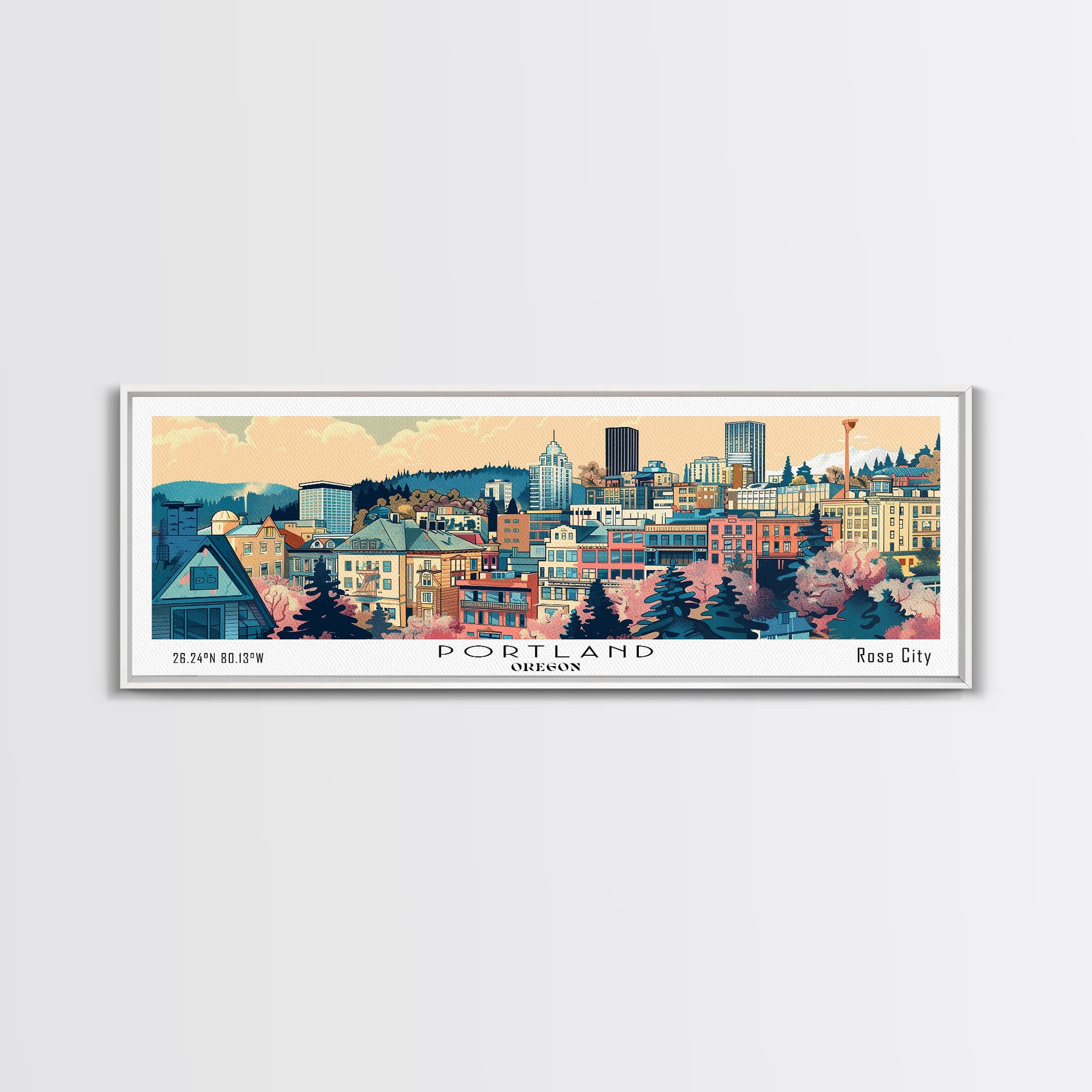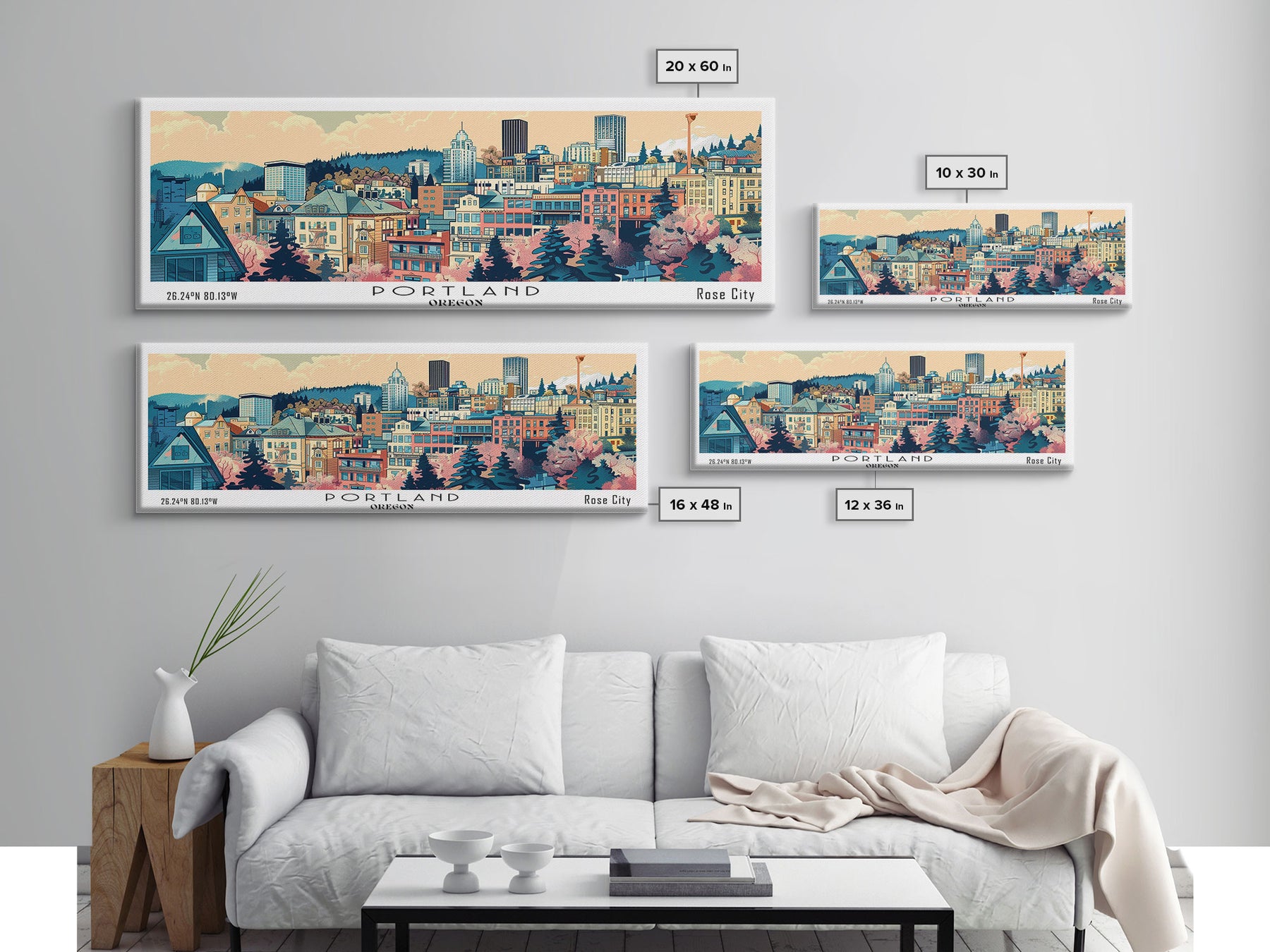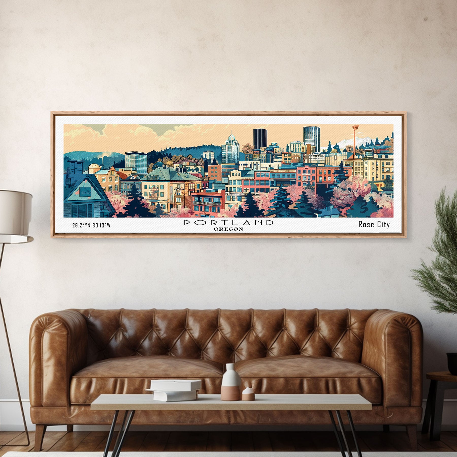 Portland Oregon Panoramic Wall Art, Mid Century Modern Framed Canvas Print, Retro Pop Art Travel Poster, City Art, Office Wall Decor, Living Room Art