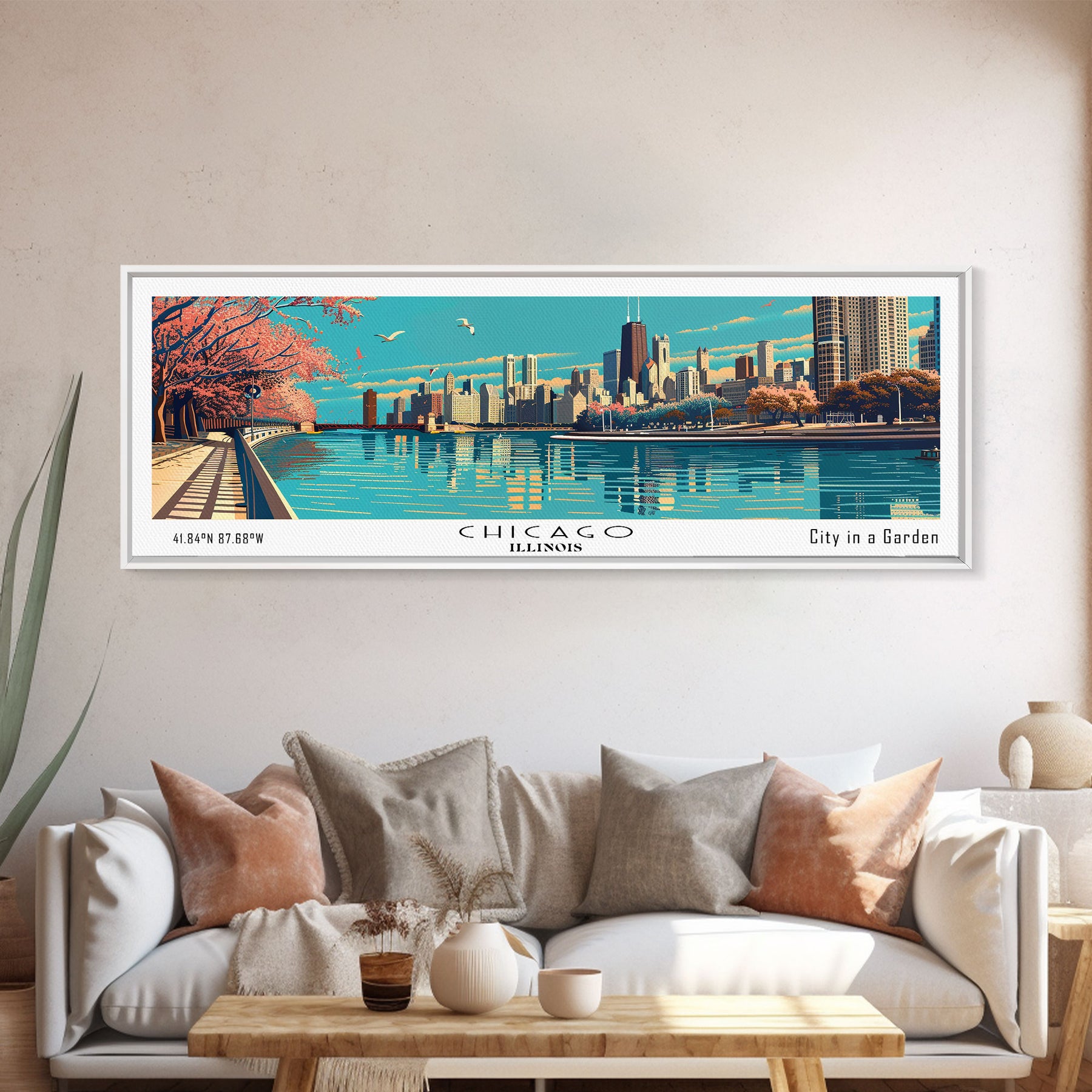 Chicago Illinois Panoramic Painting, Framed Canvas Print, Mid Century Modern Wall Art, Retro Pop Art Travel Poster, Office Decor, City Art