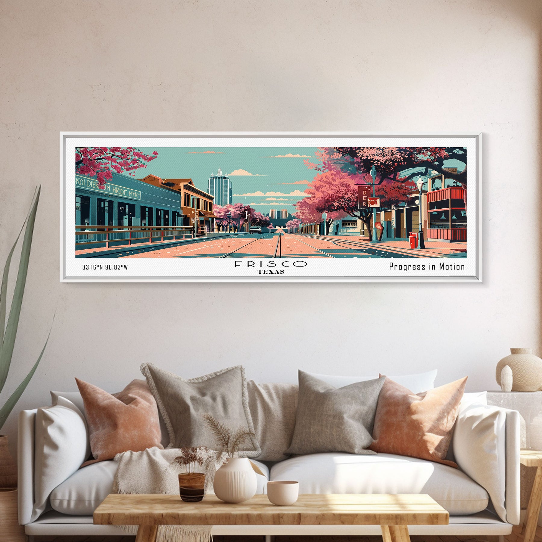 Frisco Texas Panoramic Painting, Framed Canvas Print, Mid Century Modern Wall Art, Retro Pop Art Travel Poster, Office Decor, City Art