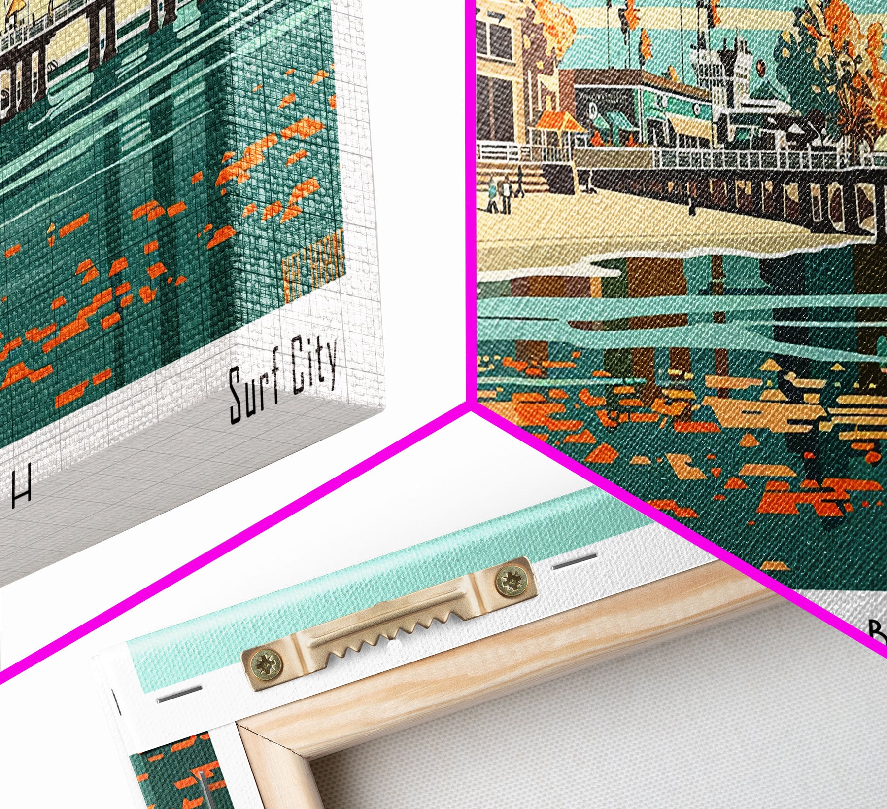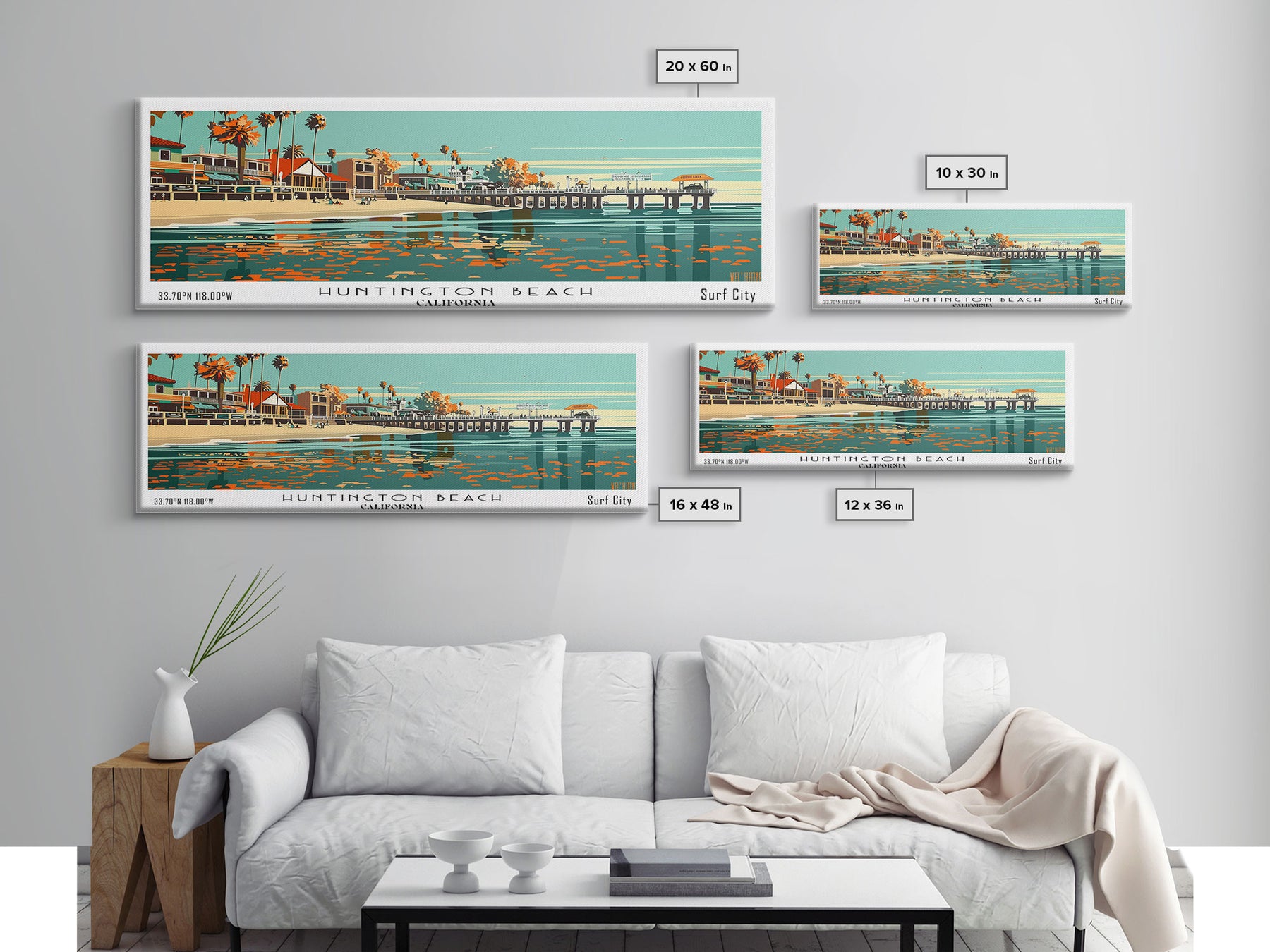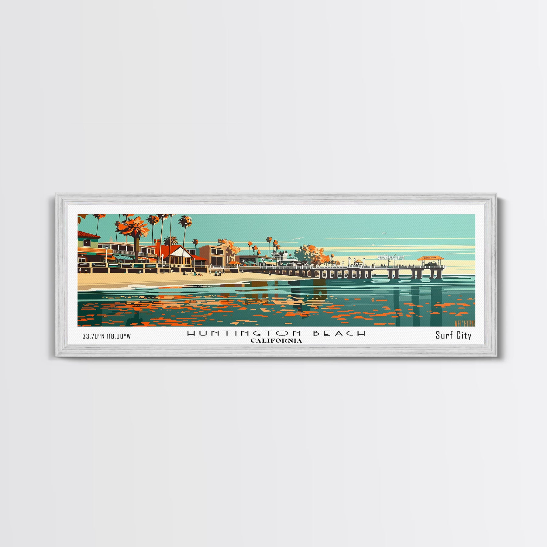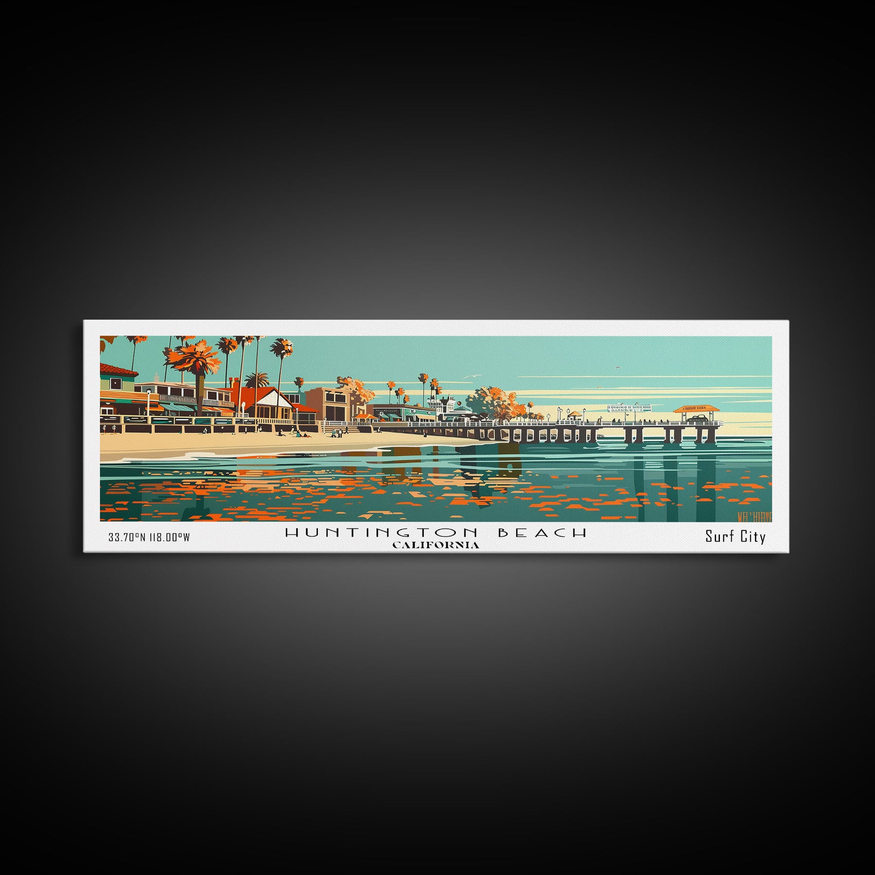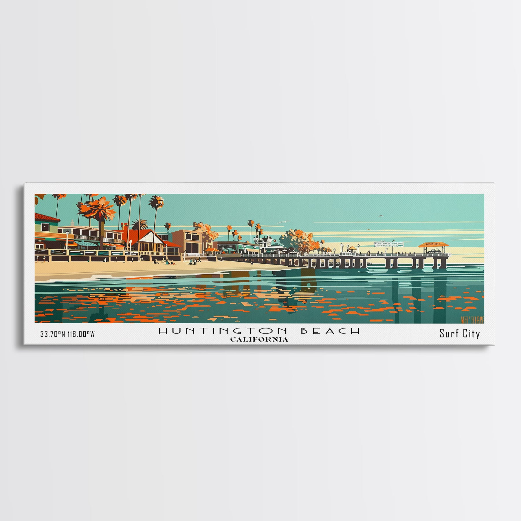 Huntington Beach California Panoramic Painting, Framed Canvas Print, Mid Century Modern Wall Art, Retro Pop Art Travel Poster, Cityscape Decor, Office Wall Art, Home Decor