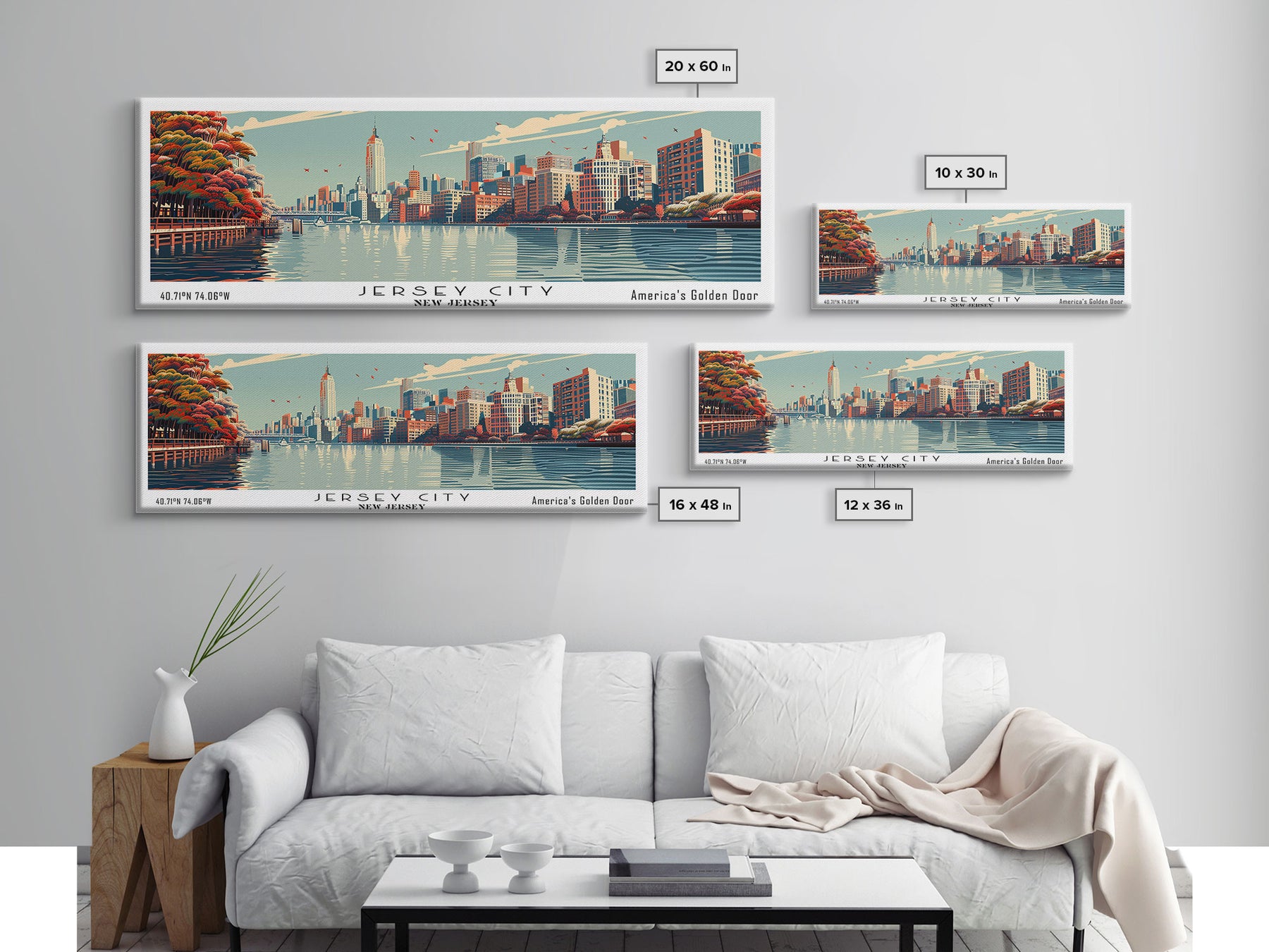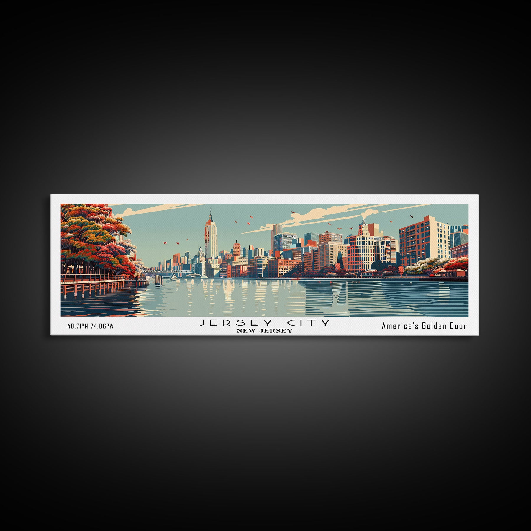 Jersey City New Jersey Panoramic Painting, Framed Canvas Print, Mid Century Modern Wall Art, Retro Pop Art Travel Poster, Cityscape Decor, Office Wall Art, Home Decor