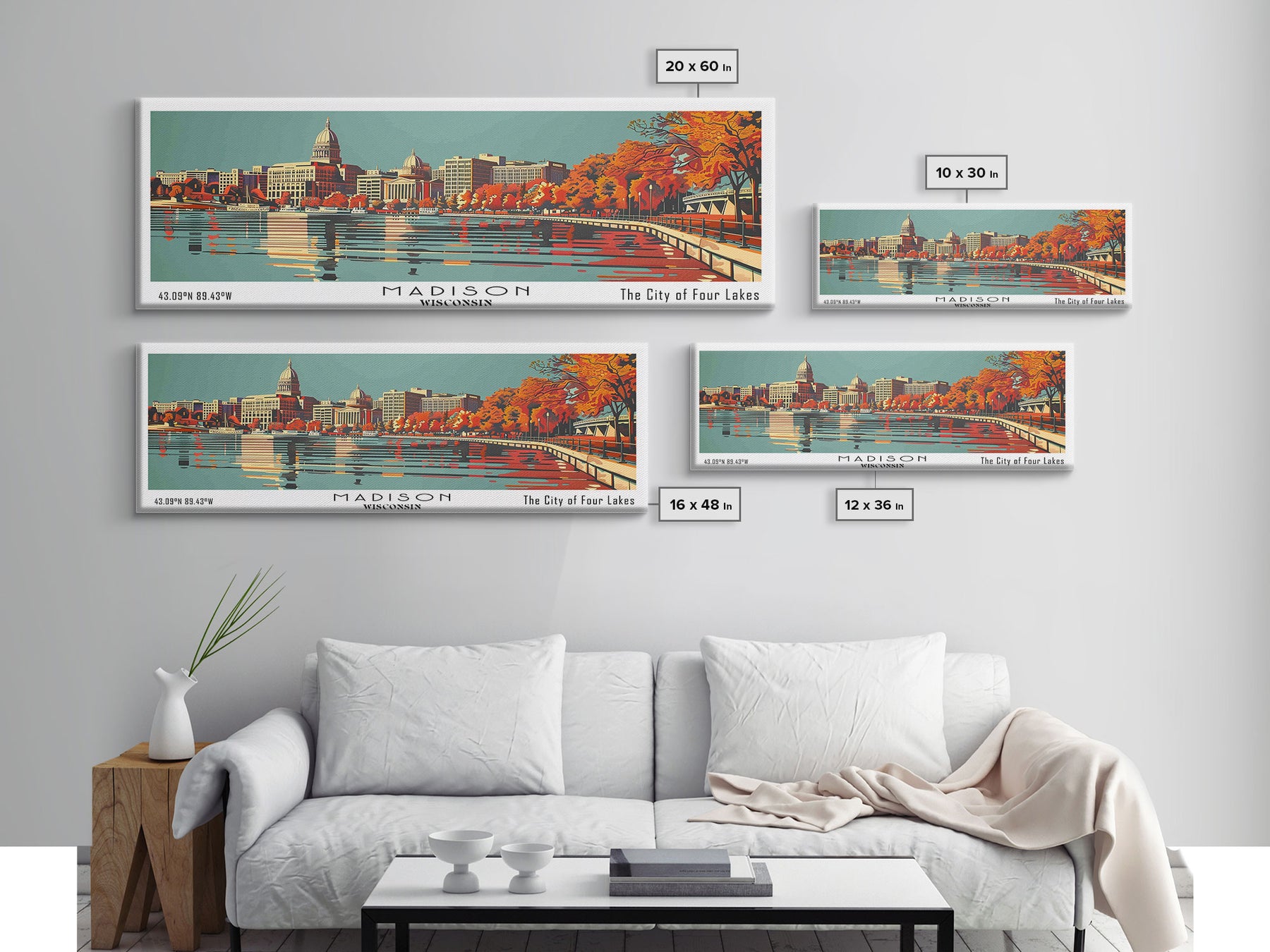 Madison Wisconsin Panoramic Wall Art, Mid Century Modern Framed Canvas Print, Retro Pop Art Travel Poster, Office Decor, Gift Idea