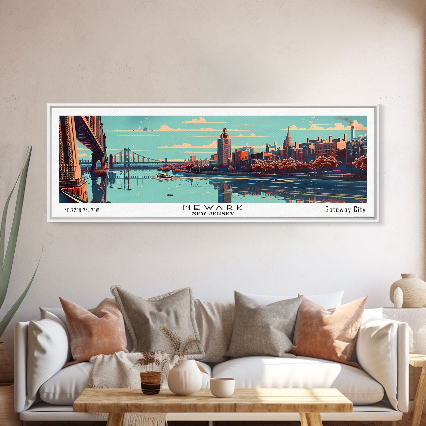 Newark New Jersey Panoramic Wall Art, Mid Century Modern Framed Canvas Print, Retro Pop Art Travel Poster, Office Decor, Gift Idea
