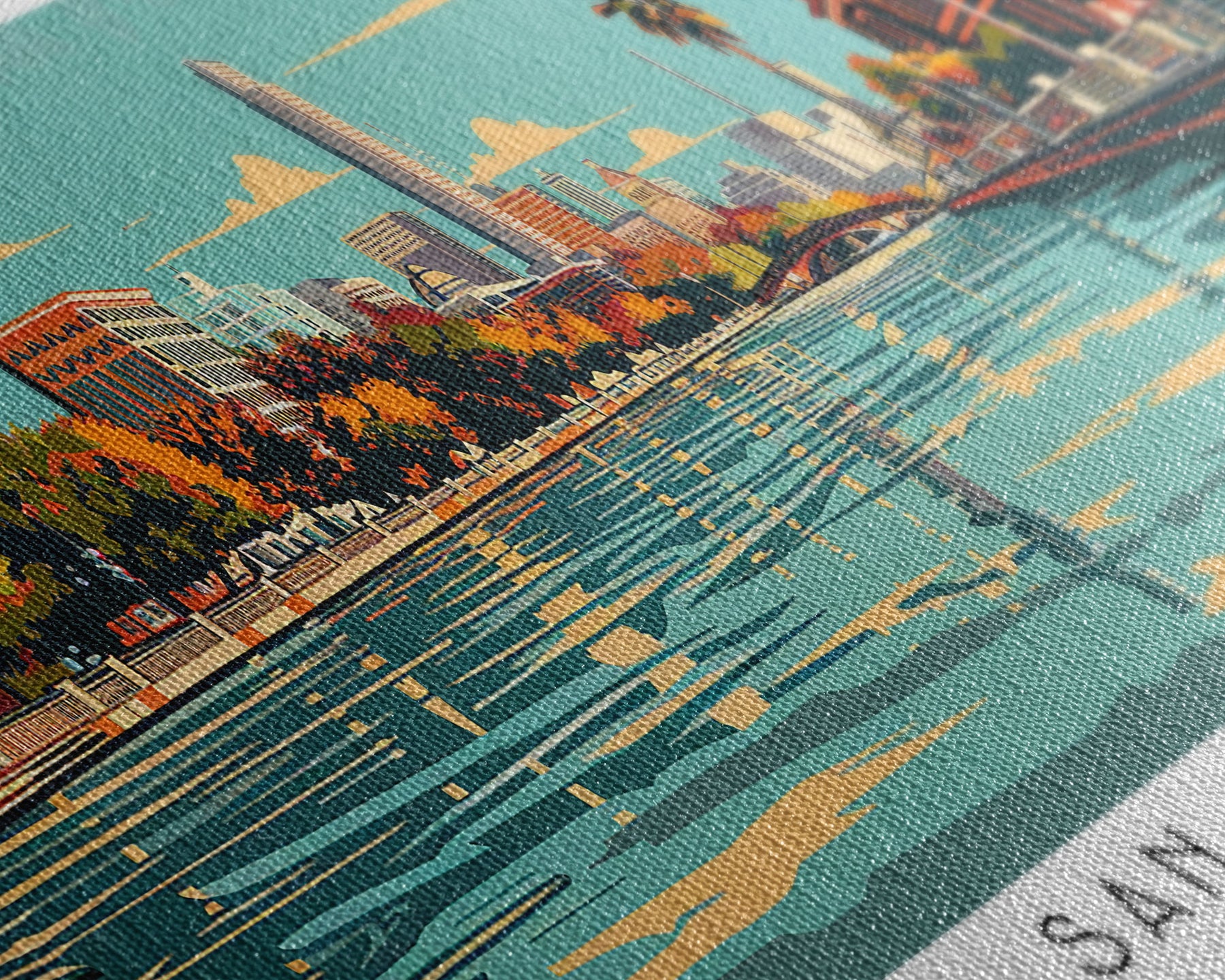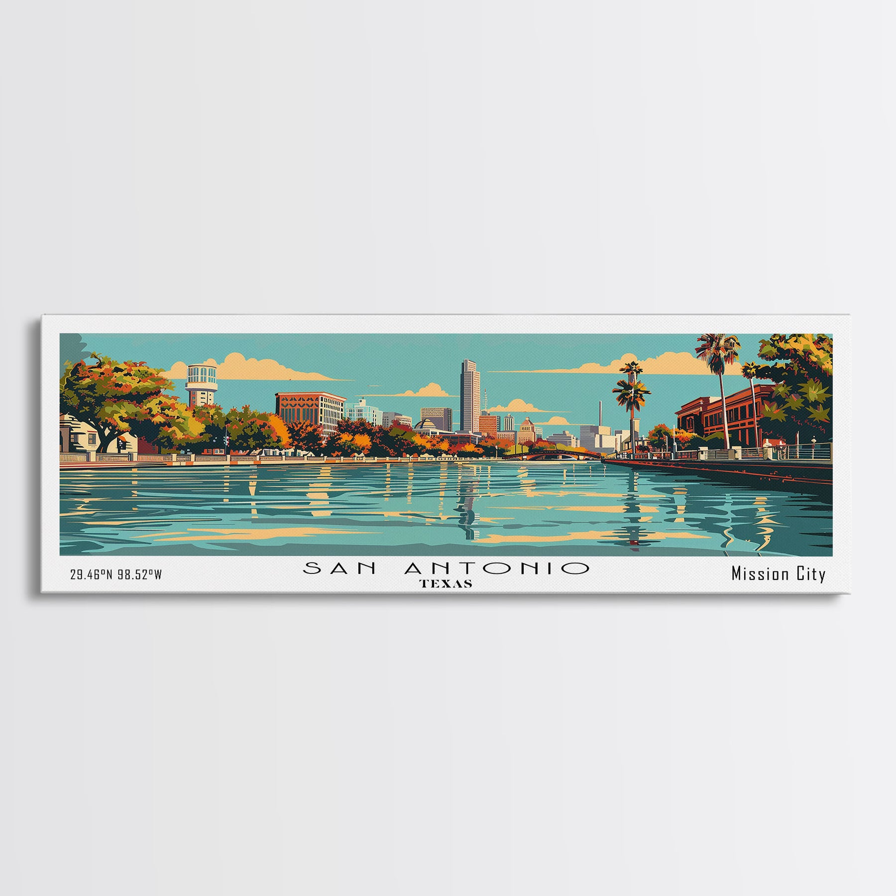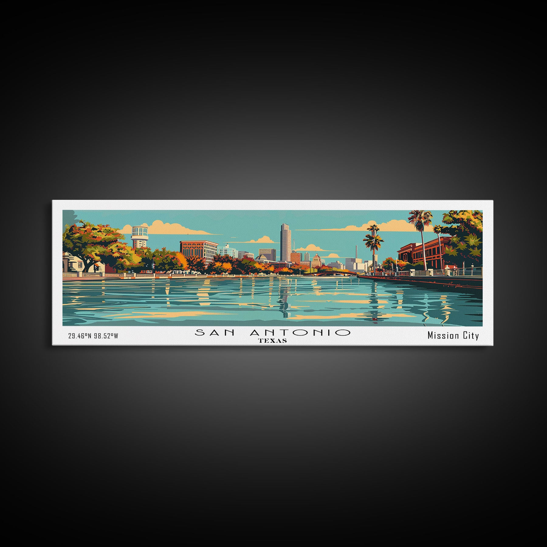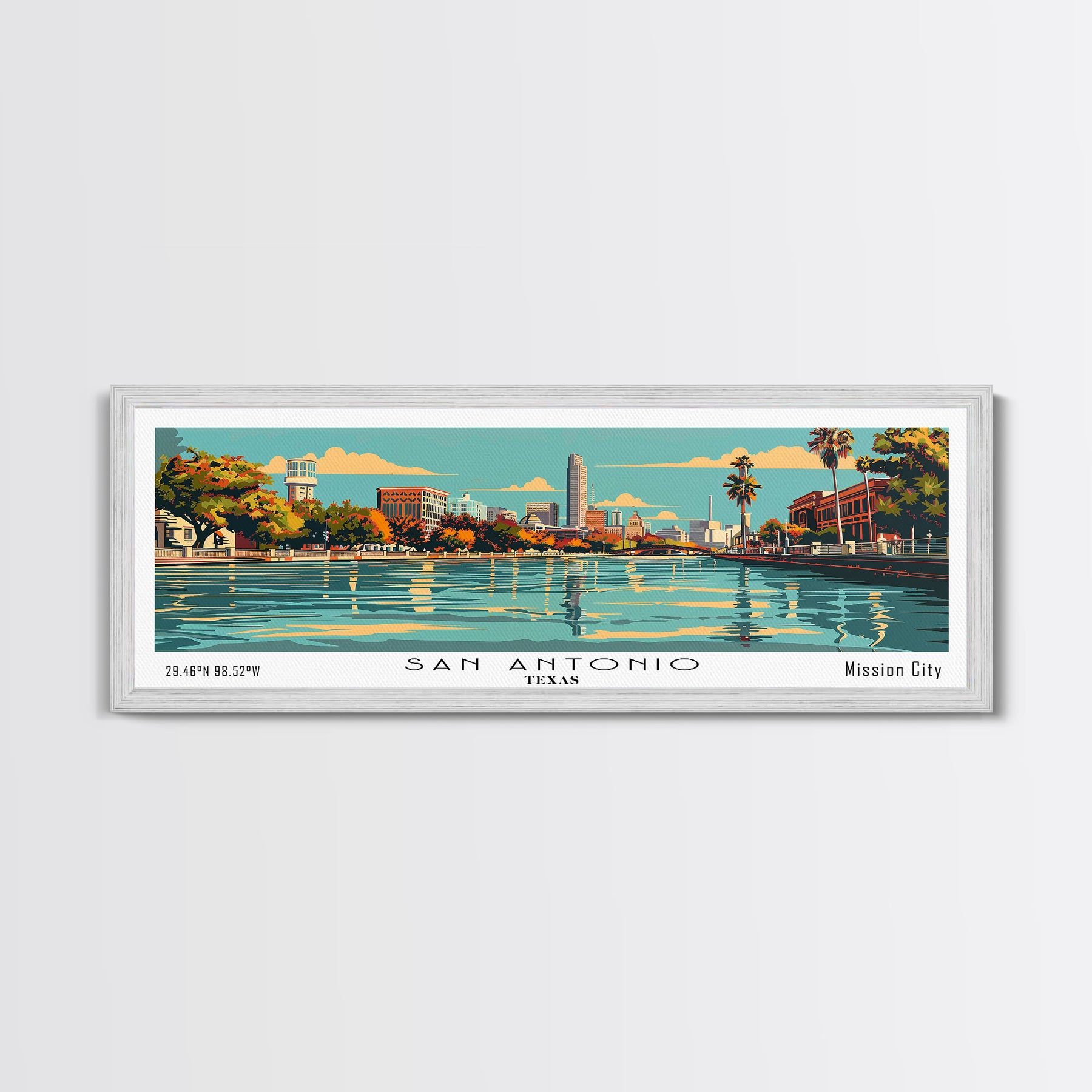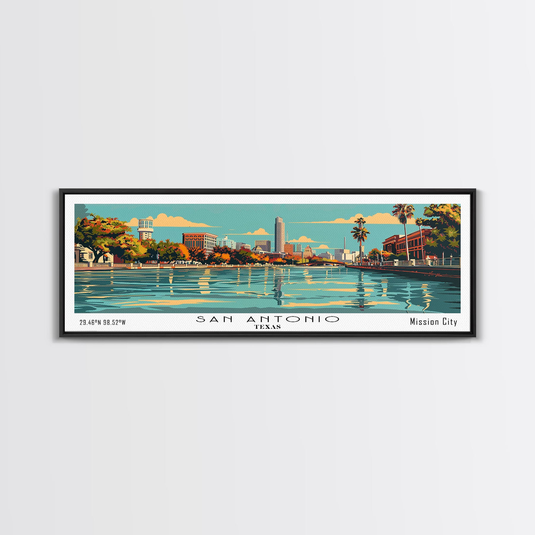 San Antonio Texas Panoramic Painting, Mid Century Modern Framed Canvas Print, Retro Pop Art Travel Poster, Cityscape, Home Decor, Office Wall Art