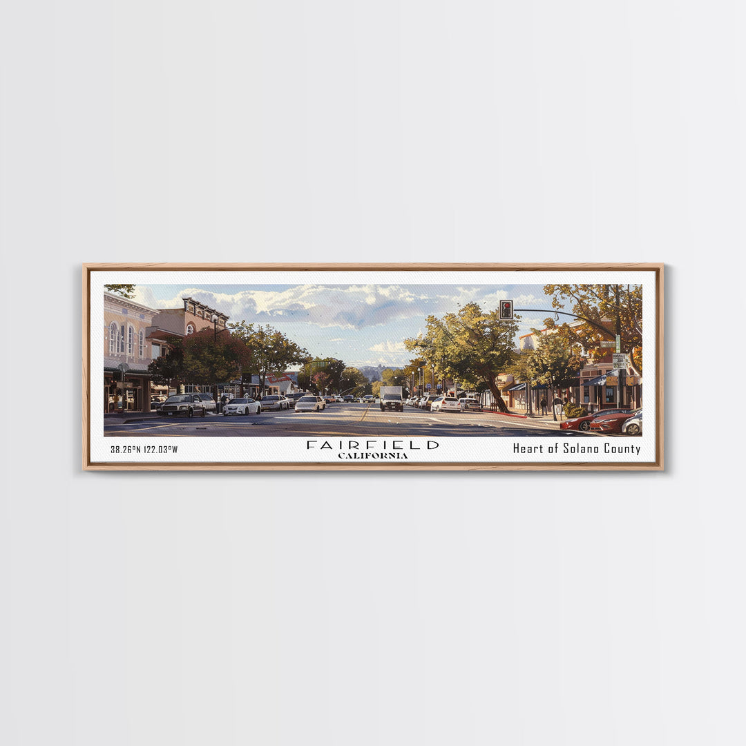 Fairfield California Panoramic Watercolor Painting, Scenic Framed Canvas Print, Urban Wall Art for Living Room, Travel Poster, Home Decor, City Gift Idea