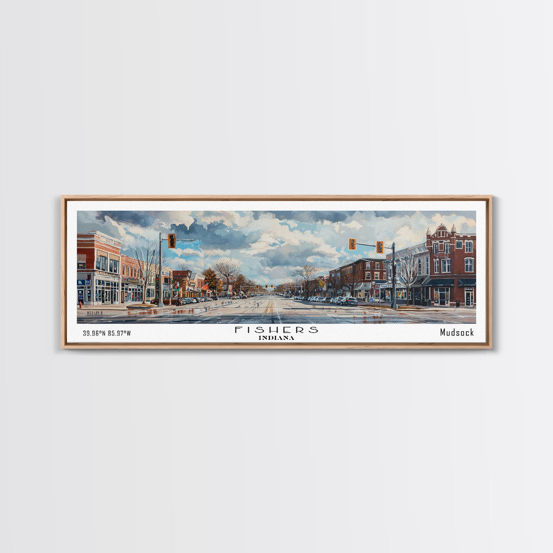 Fishers Indiana Panoramic Watercolor Painting, Scenic Framed Canvas Print, Urban Wall Art for Office, Travel Decor, City Print, Gift Idea
