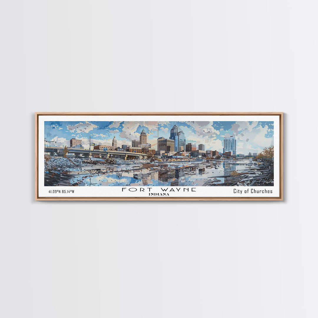 Fort Wayne Indiana Panoramic Watercolor Painting, Scenic Framed Canvas Print, Urban Wall Art for Office, Travel Decor, City Print, Gift Idea