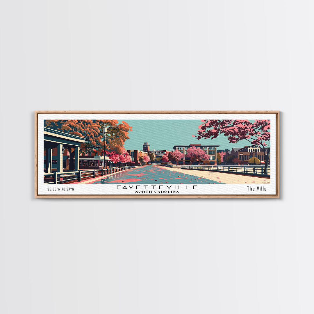 Fayetteville North Carolina Panoramic Painting, Framed Canvas Print, Mid Century Modern Wall Art, Retro Pop Art Travel Poster, Home Decor, City Art