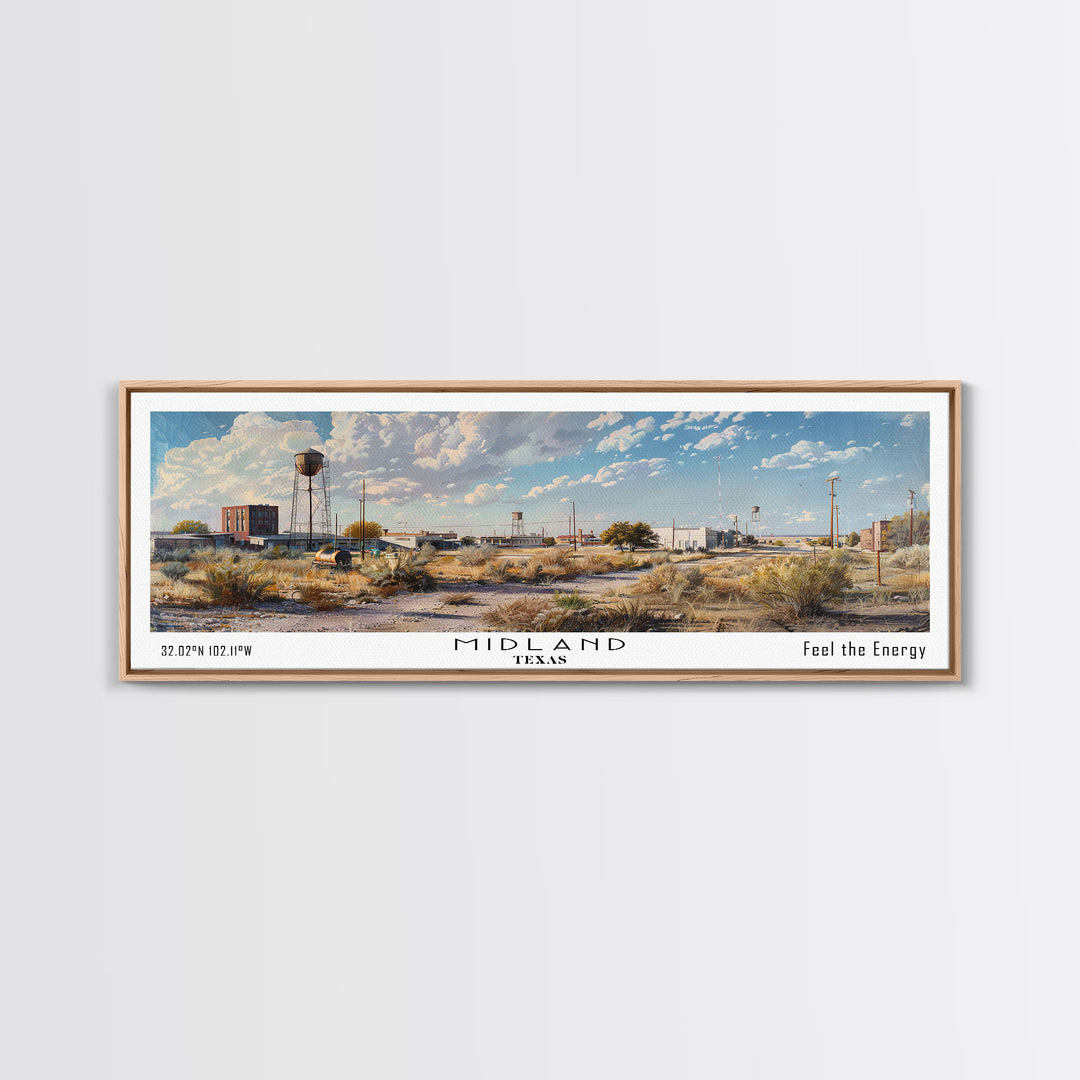 Midland Texas Panoramic Wall Art, Mid Century Modern Framed Canvas Print, Retro Pop Art Travel Poster, Living Room Art