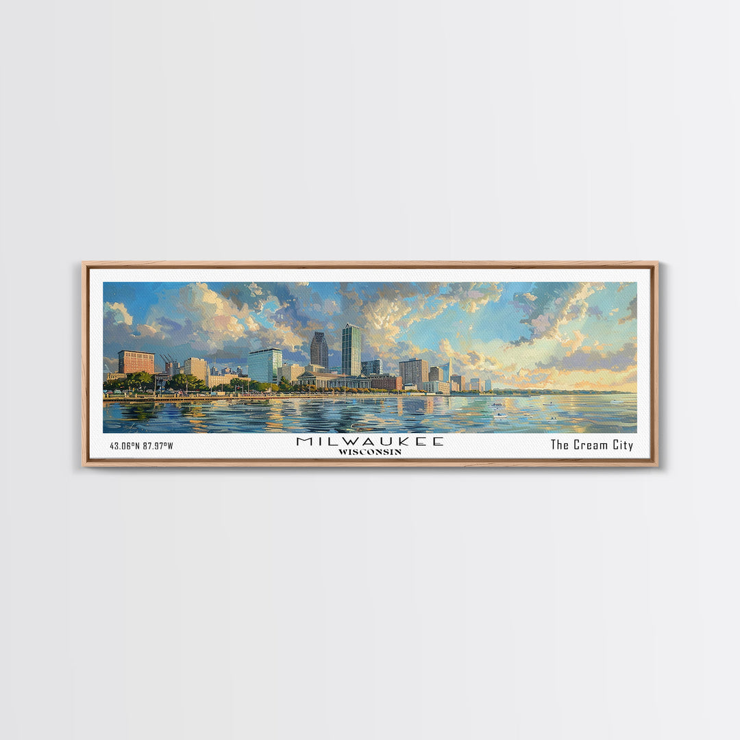 Milwaukee Wisconsin Panoramic Wall Art, Mid Century Modern Framed Canvas Print, Retro Pop Art Travel Poster, Office Decor, Living Room Art