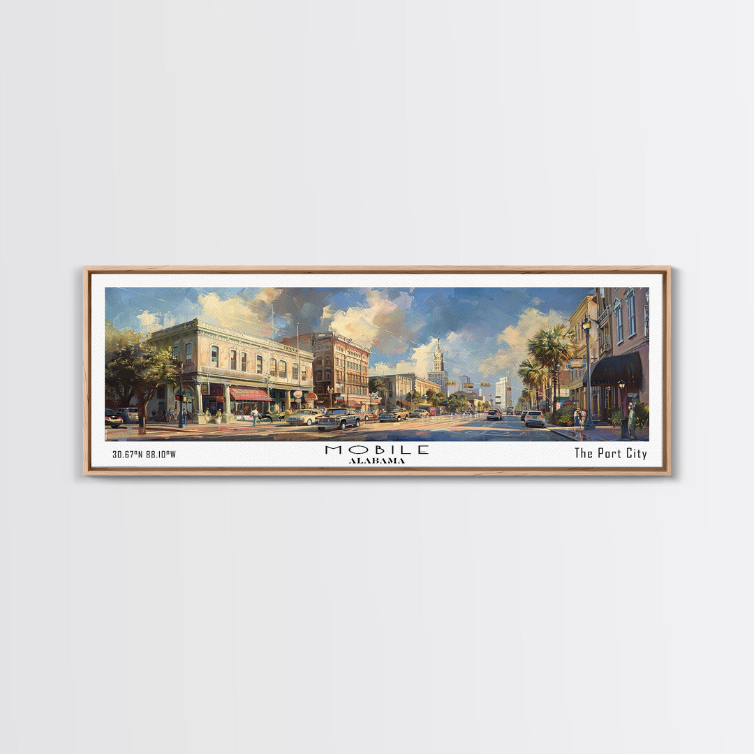 Mobile Alabama Panoramic Framed Canvas Print, Watercolor City Art, Office Wall Decor, Travel Poster, Living Room Decor, City Print