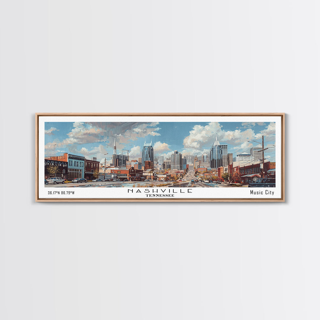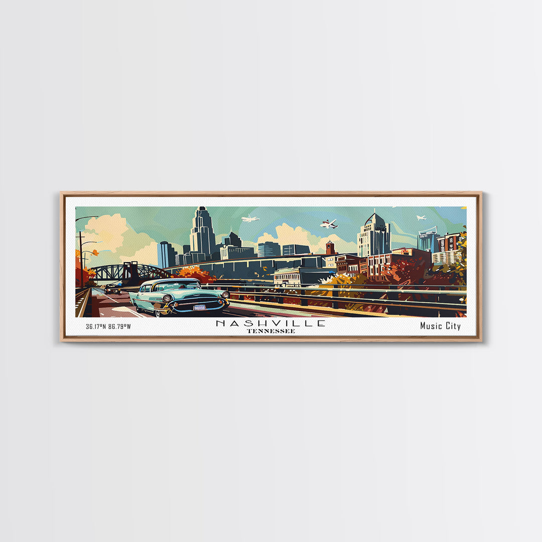 Nashville Tennessee Panoramic Wall Art, Mid Century Modern Framed Canvas Print, Retro Pop Art Travel Poster, Home Wall Decor