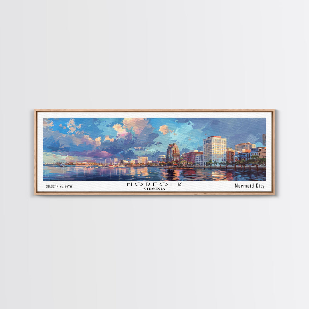 Norfolk Virginia Panoramic Framed Canvas Print, Cityscape Watercolor Painting, Modern Wall Art for Home Decor, Travel Poster, Urban Gift Idea