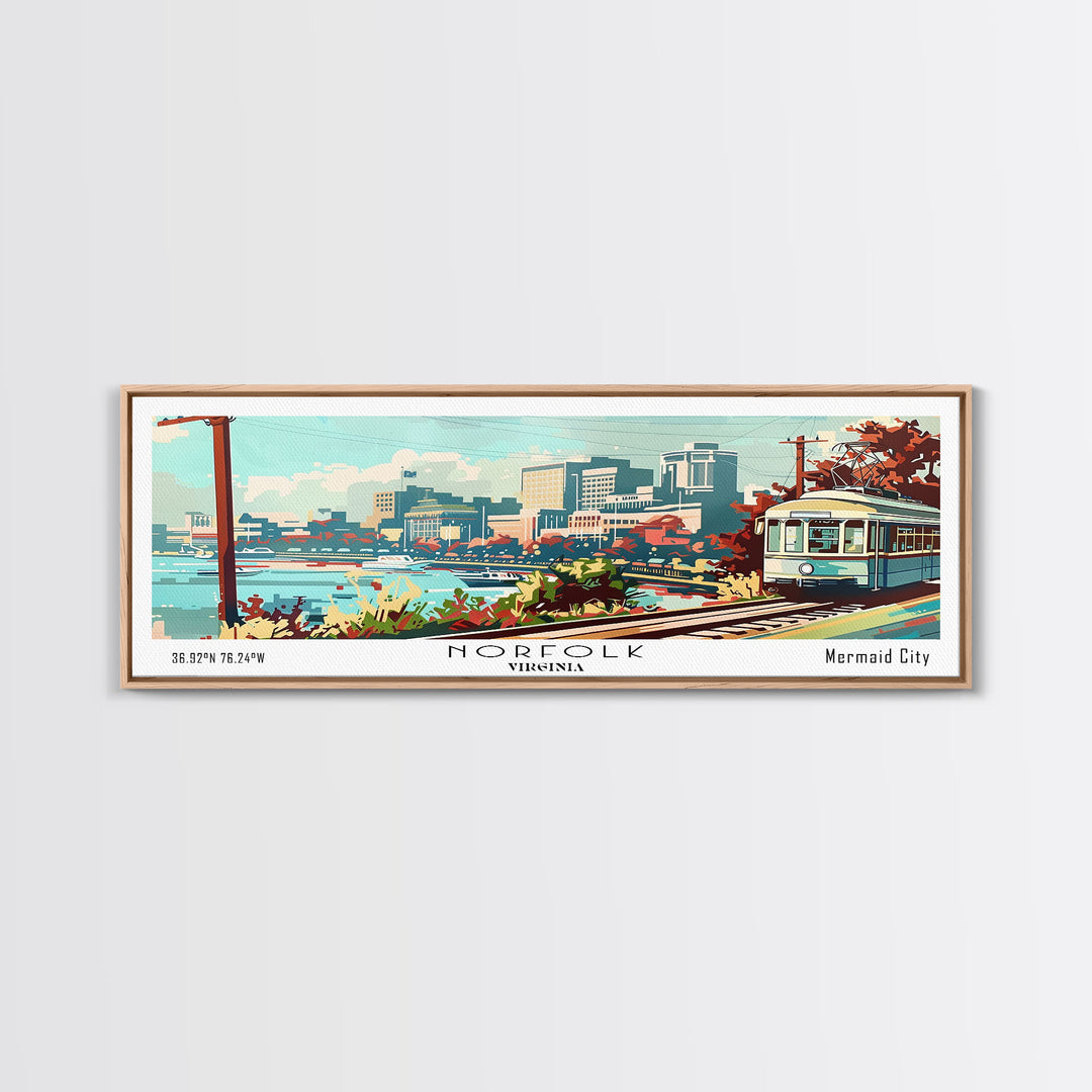 Norfolk Virginia Panoramic Framed Canvas Print, Retro Style Wall Art, Mid Century Modern Home Decor, Pop Art Travel Poster