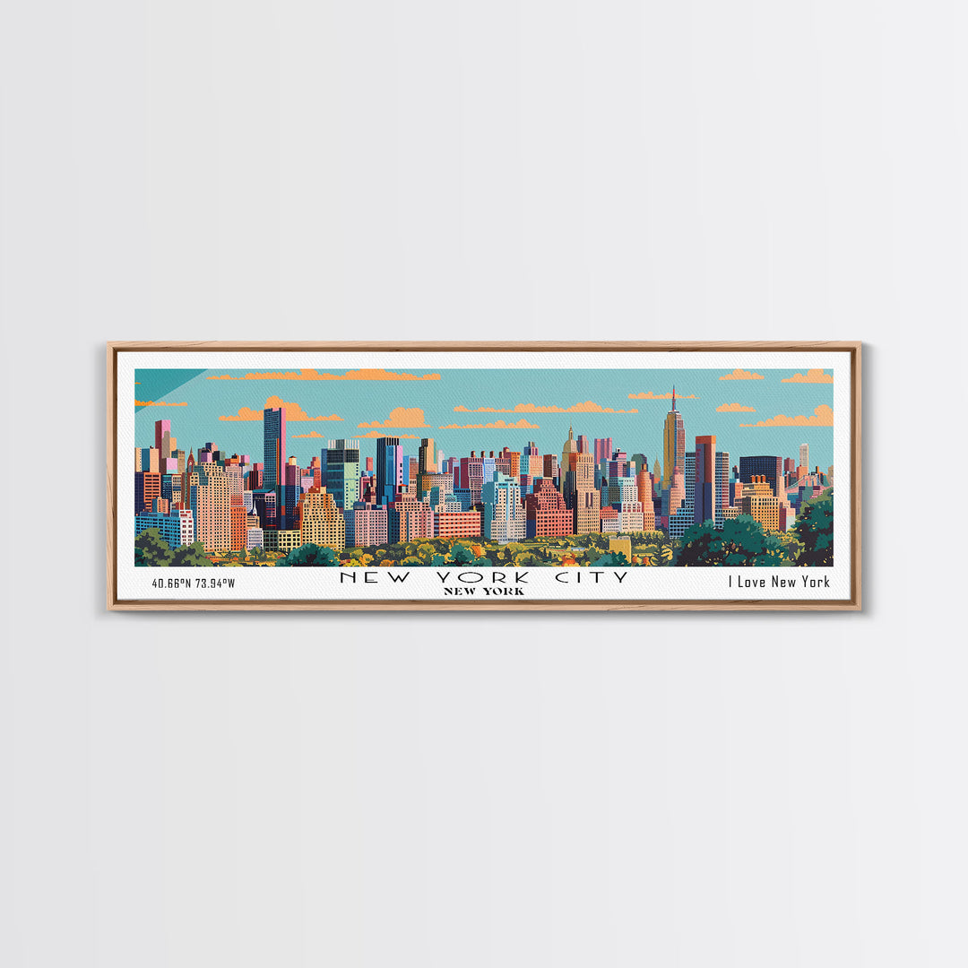 New York New York Panoramic Wall Art Framed Canvas Print, Travel Poster, Mid Century Modern Art, Pop Art Style, Wall Decor, Office Wall Art