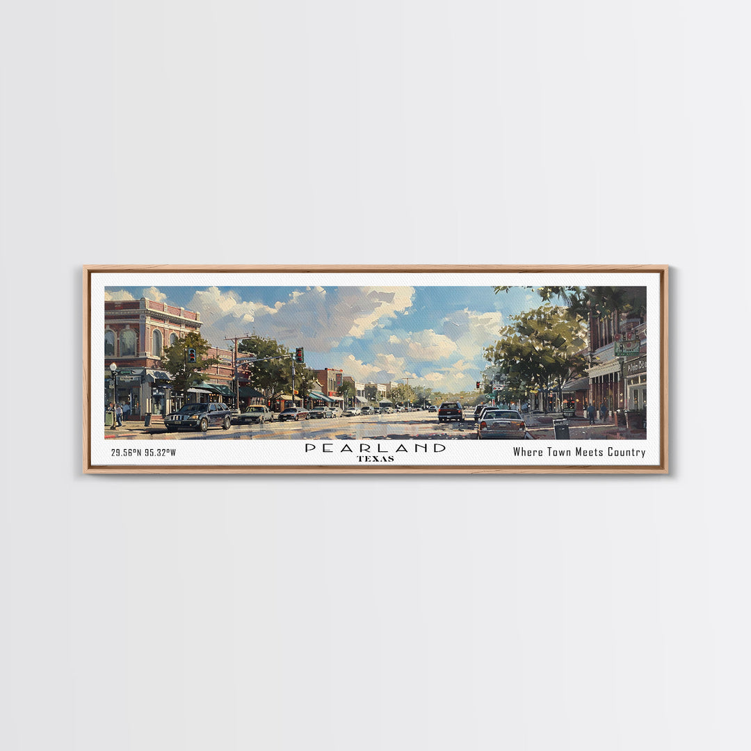 Pearland Texas Panoramic Framed Canvas Print, Cityscape Watercolor Painting, Travel Poster for Home Decor, Urban Art, Unique Gift Idea
