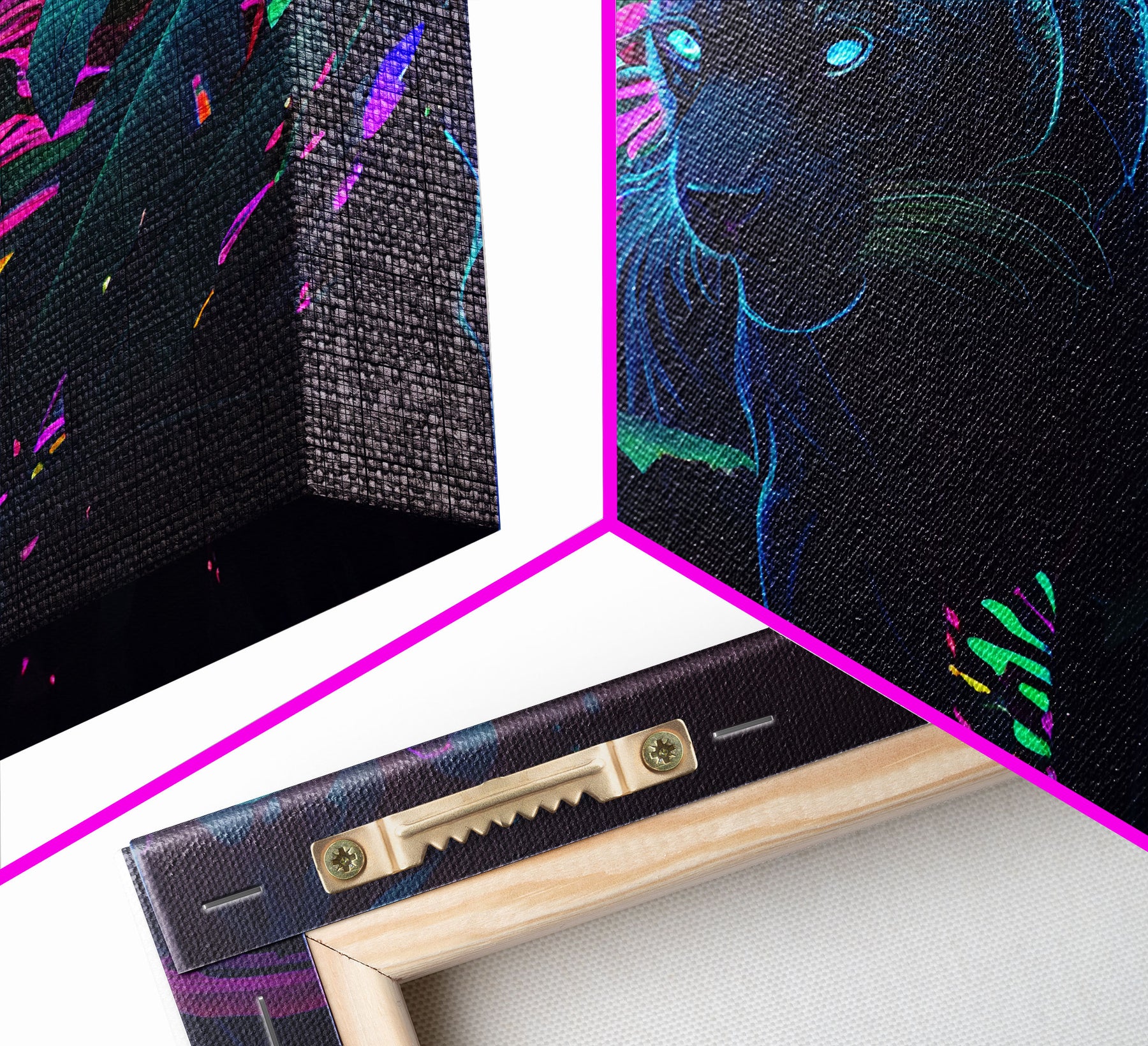 Black panther on the hunt in the jungle, glowing blue eyes, synth wave aesthetic art, framed canvas print